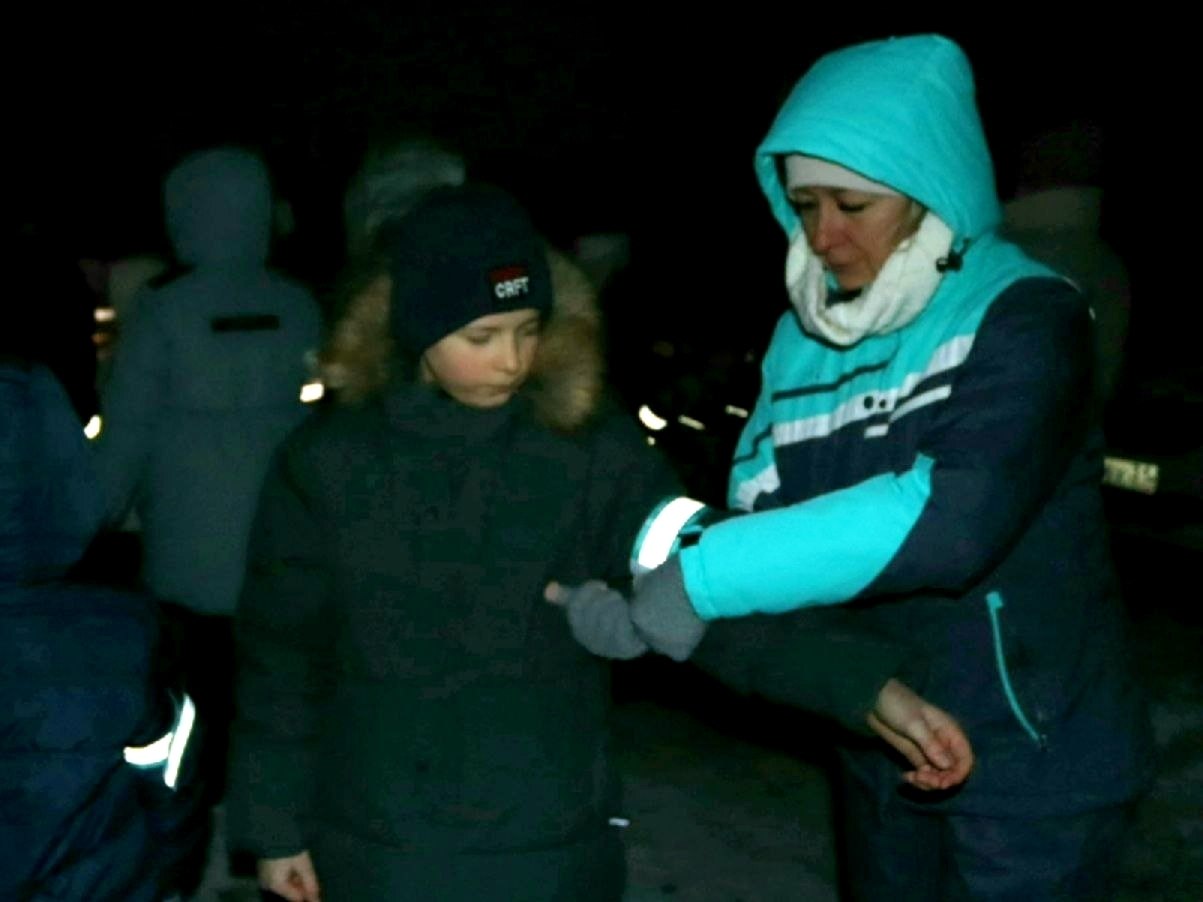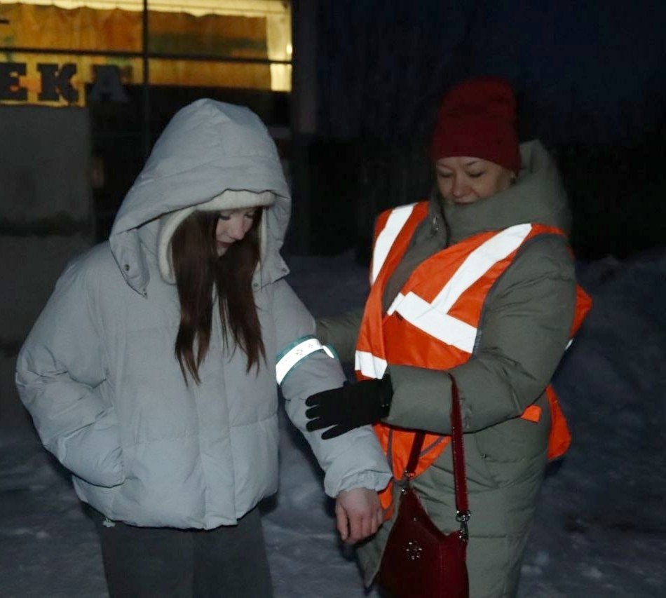 Организаторы вручили ребятам яркие светоотражающие повязки, а затем помогли надёжно закрепить их на верхней одежде. Использование таких элементов в несколько раз увеличивает видимость пешехода в свете фар и является одним из самых эффективных способов предотвратить ДТП.