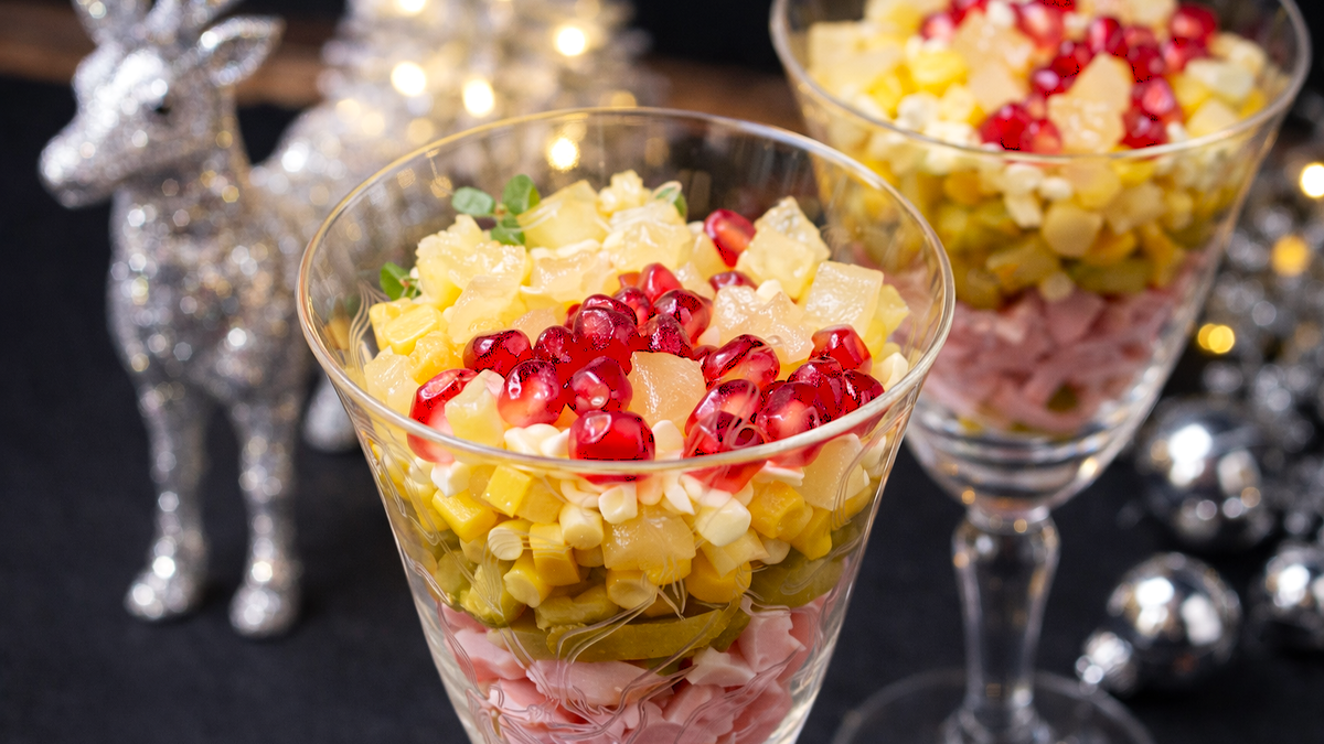 Добавление фруктовых нот с ананасом не только освежает вкус, но и делает внешний вид салата более нарядным. Каждый слой хорошо просматривается сквозь стекло, а зёрна граната или щепотка орехов добавляют ярких акцентов.