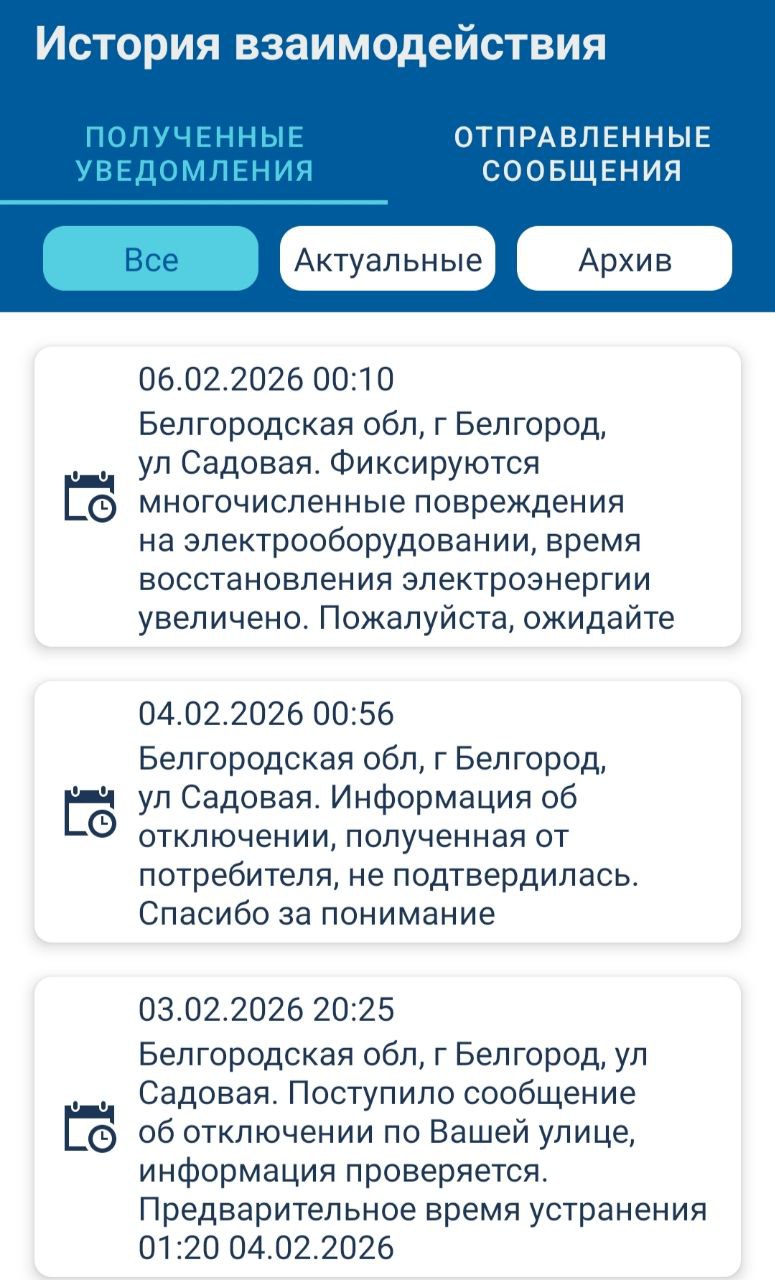 Информации о возможном возвращении света, например на Садовую в Белгороде, в приложении Есть свет пока не дают.