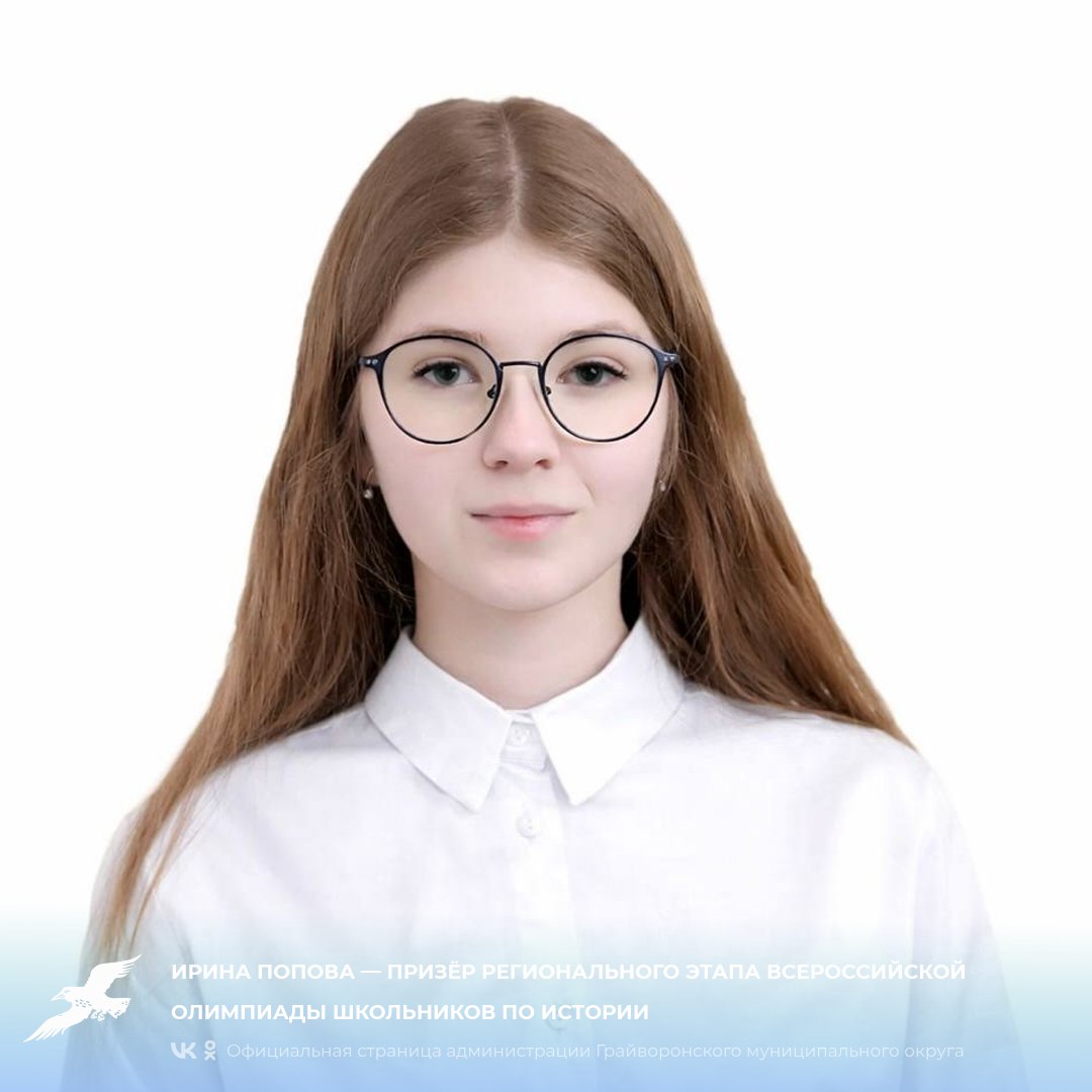 Грайворонский округ на олимпиаде представила ученица 9 класса Головчинской школы Ирина Попова. Ответственность и целеустремлённость Ирины, а также плодотворная работа руководителя — учителя истории и обществознания Натальи Назаренко — принесли свои плоды. В ходе серьёзной конкуренции Ирина показала высокий результат и вошла в число призёров.