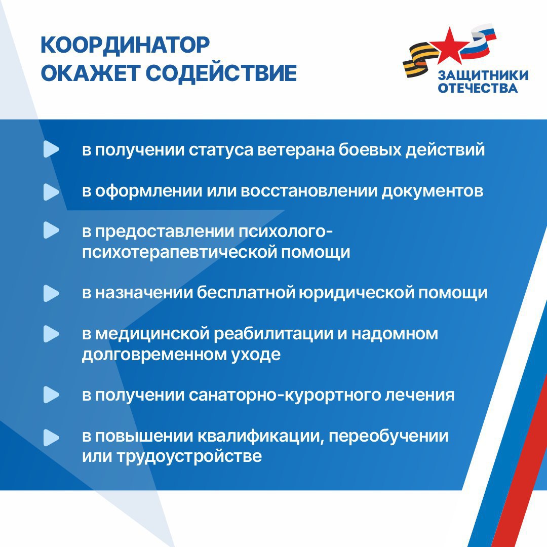 В карточках – подробнее о том, чем социальные координаторы могут быть полезны ветеранам спецоперации и их семьям.