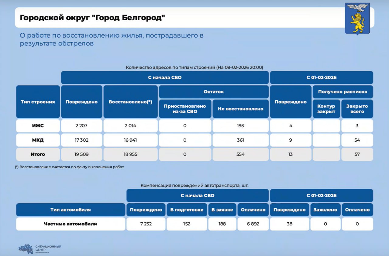 За прошедшую неделю в Белгороде повреждения получили 38 автомобилей. С учётом этих машин в работе у экспертов-оценщиков остаётся 152 транспортных средства. Завершить оценку повреждений планируют до 15 февраля.
