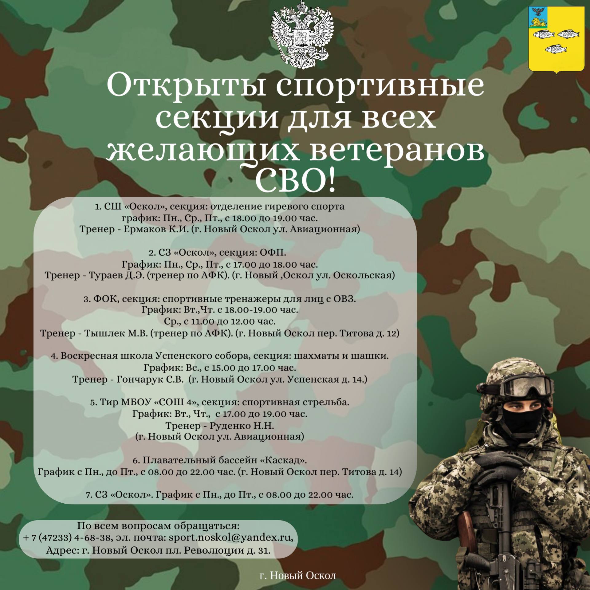 • Адрес: г. Новый Оскол, пл. Революции, д. 31 (управление физической культуры и спорта).