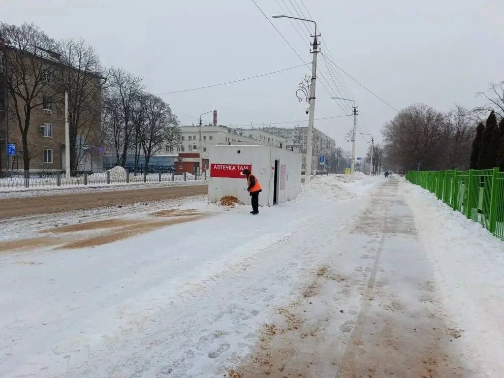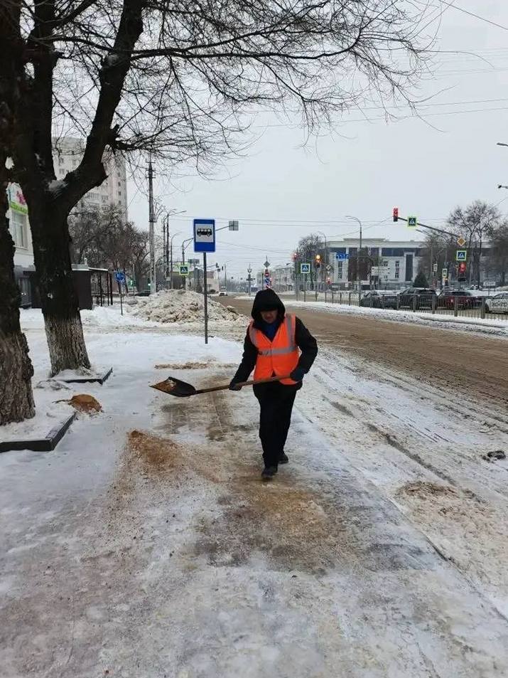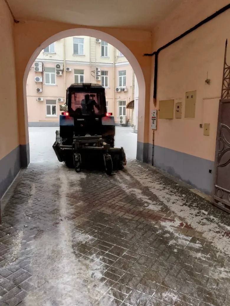 Проводится механизированное разметание тротуаров и их обработка противогололёдными материалами. За сутки планируют израсходовать 166,5 тонны пескосоляной смеси.