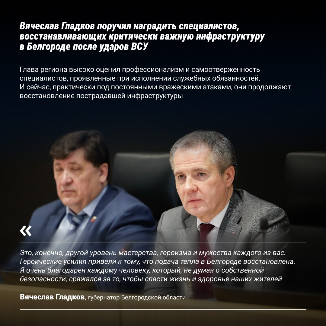 Вячеслав Гладков распорядился наградить специалистов, которые занимаются восстановлением жизненно важной инфраструктуры после обстрелов со стороны ВСУ.