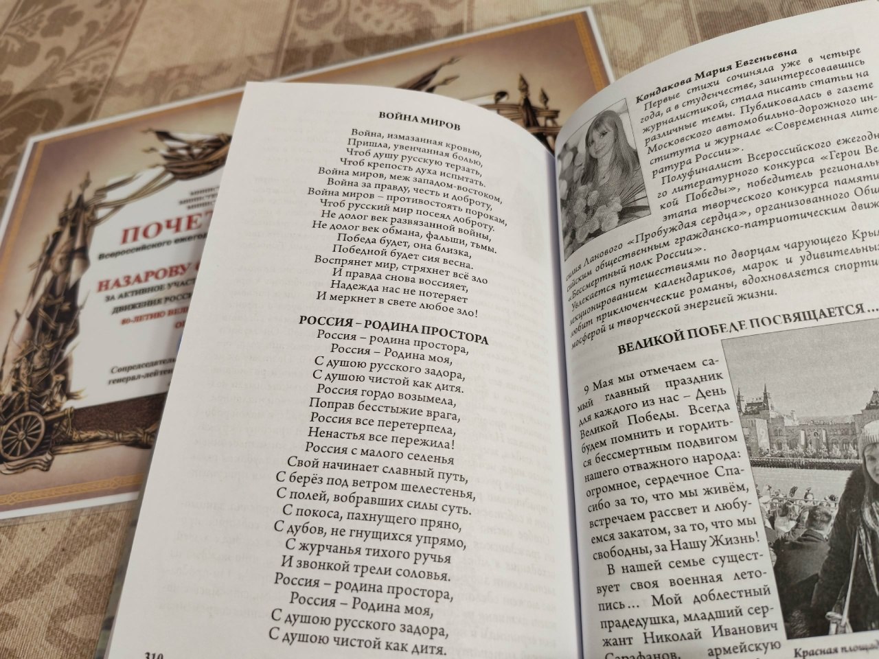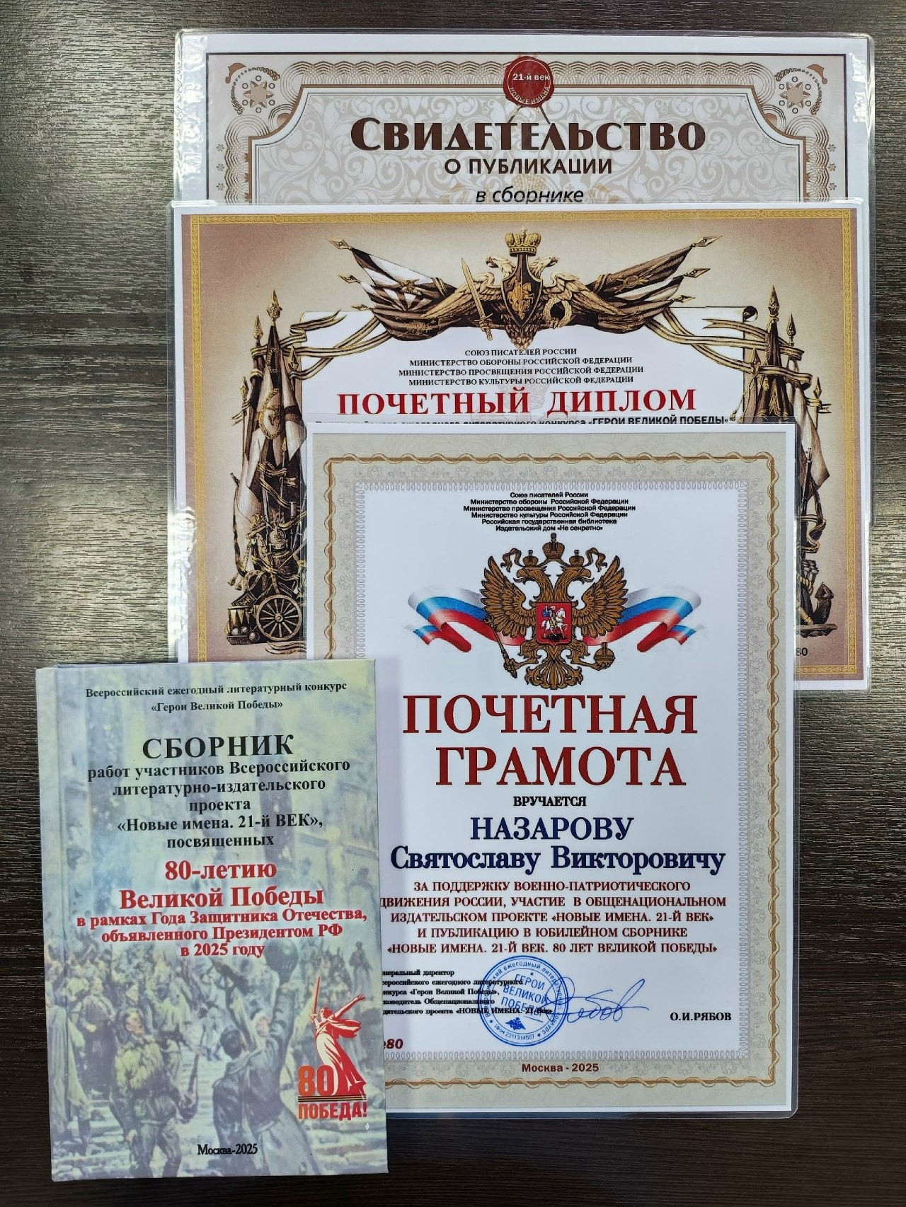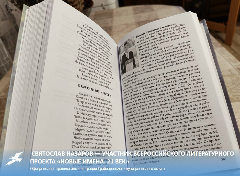 В прошлом году Святослав Назаров отправил заявку на ежегодный литературный конкурс и представил два своих стихотворения. Удивительно, но он не только прошёл отбор, но и его работы вошли в юбилейный сборник участников Всероссийского проекта «Новые имена. 21 век». Книга посвящёна 80-летию Великой Победы в рамках Года Защитника Отечества, объявленного Президентом РФ в 2025 году.