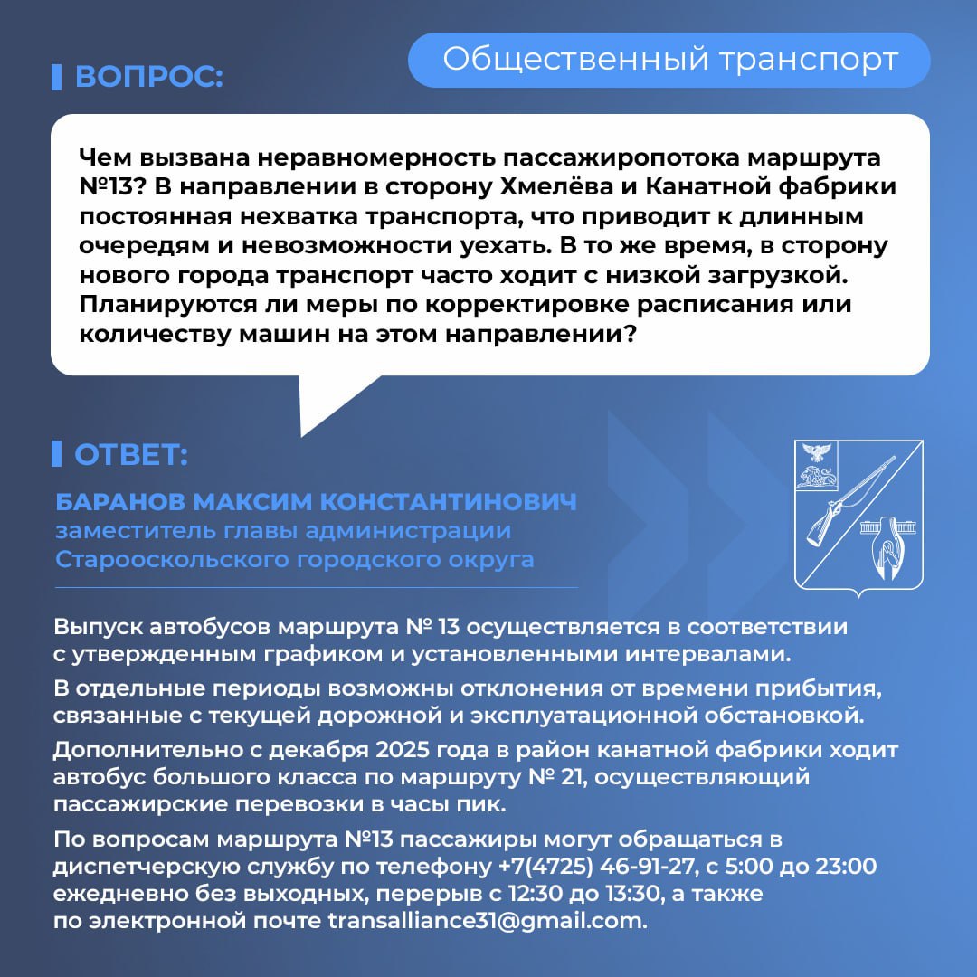 Разберём вопрос о работе маршрута №13. Пассажиры сообщают о длинных очередях и переполненных автобусах в часы пик.