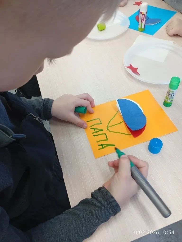 Малыши с радостью приняли участие в викторине, посмотрели познавательный мультфильм о героях Отечества, приняли участие в динамической физкультминутке, выполнив комплекс упражнений, а также своими руками создали поздравительные открытки для своих пап – участников специальной военной операции.