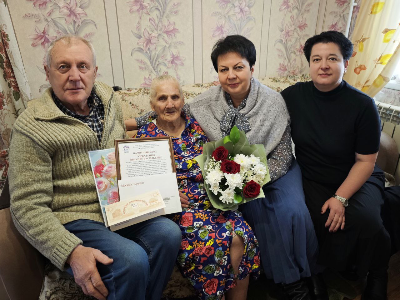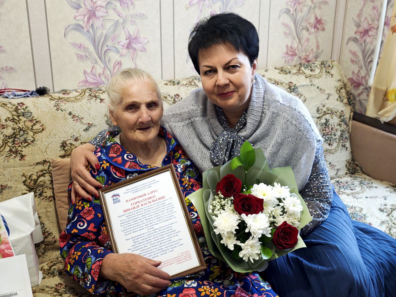 От меня лично и от всех жителей Корочанского муниципального округа Зинаиду Васильевну поздравила председатель Совета депутатов Корочанского муниципального округа Марина Петровна Афанаськова. Она вручила имениннице персональное поздравление от Президента Российской Федерации Владимира Владимировича Путина и памятный адрес от Корочанского местного отделения Всероссийской политической партии «Единая Россия».