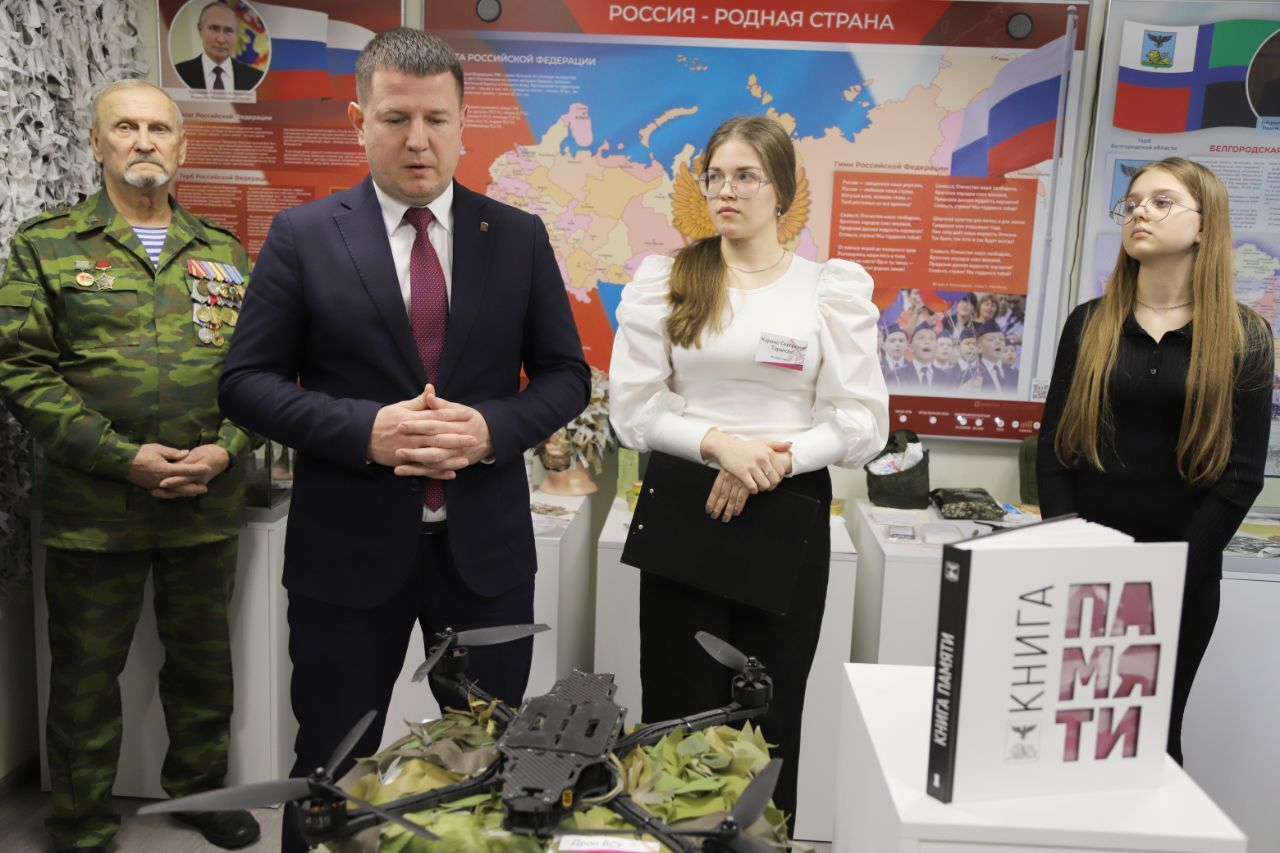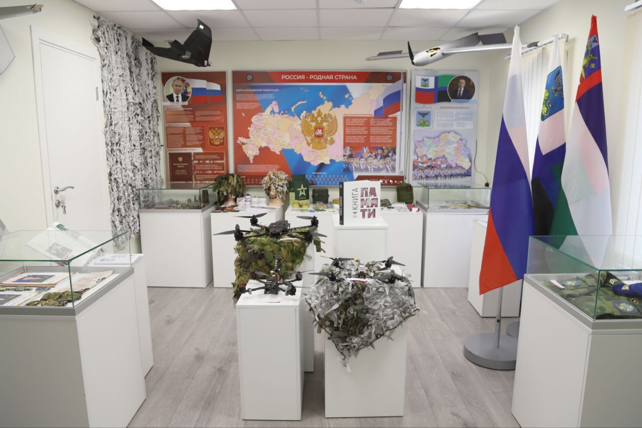 Музейная комната содержит стенды с реквизитами СВО, элементами различных боеприпасов, БПЛА, тактической аптечки, стяга СВО, рациона питания наших бойцов в полевых условиях и другому. Выставочное пространство будет постоянно пополняться.