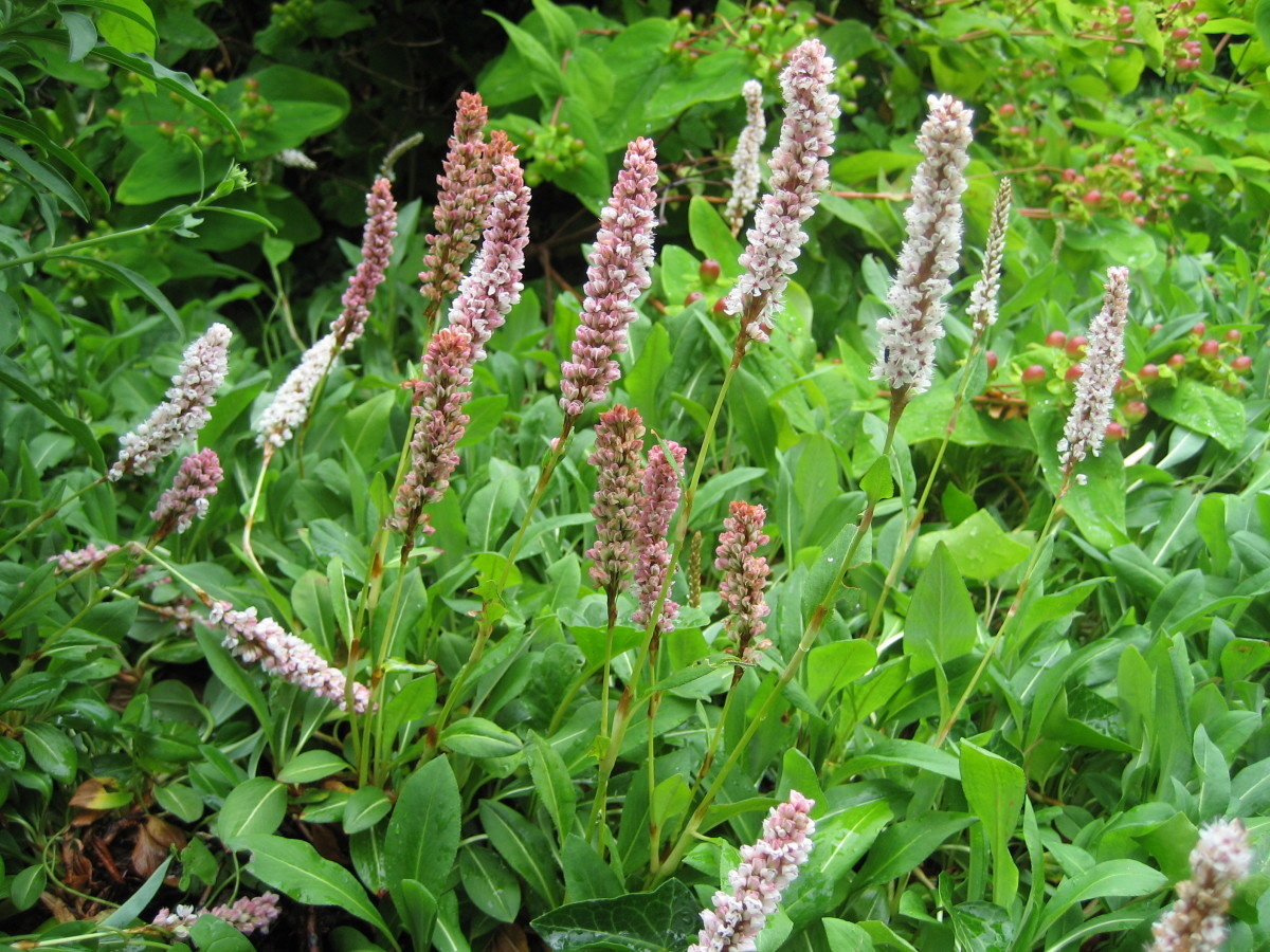 - Горец змеиный привлекает своей знакомой всем формой. Этот вечнозеленый многолетник с розовыми соцветиями продолжает оставаться популярным на дачах и в садах.