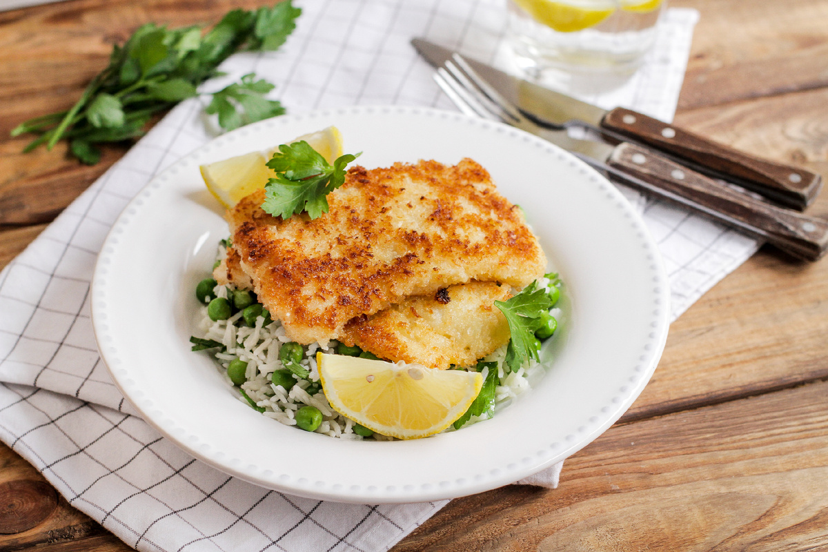 Этап 3: Осмотрите филе трески на наличие костей и нарежьте на порционные куски. В одной миске смешайте яйцо с молоком, а в две другие тарелки выложите муку и сухари панко. Обваляйте каждую рыбку сначала в муке, затем в яичной массе и наконец в сухарях. Обжаривайте на сковороде с оставшимся маслом по 3-4 минуты с каждой стороны до золотистой корочки.
