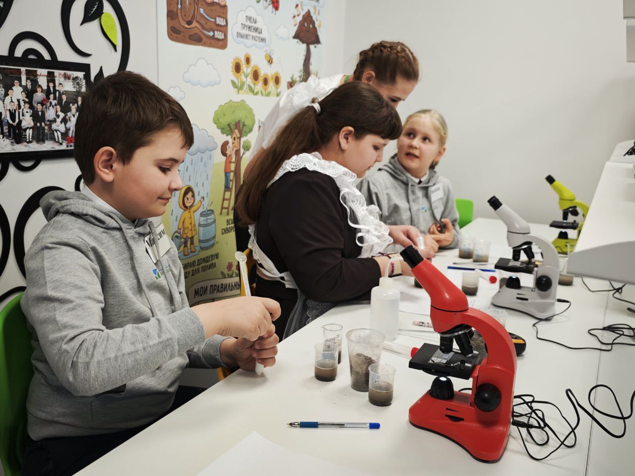 Министрам представили класс ранней профессиональной ориентации в сельском хозяйстве для учеников начальной школы. Проект реализуется при участии якорного работодателя – компании «Зелёная долина» и позволяет с ранних лет знакомить детей с аграрными профессиями.