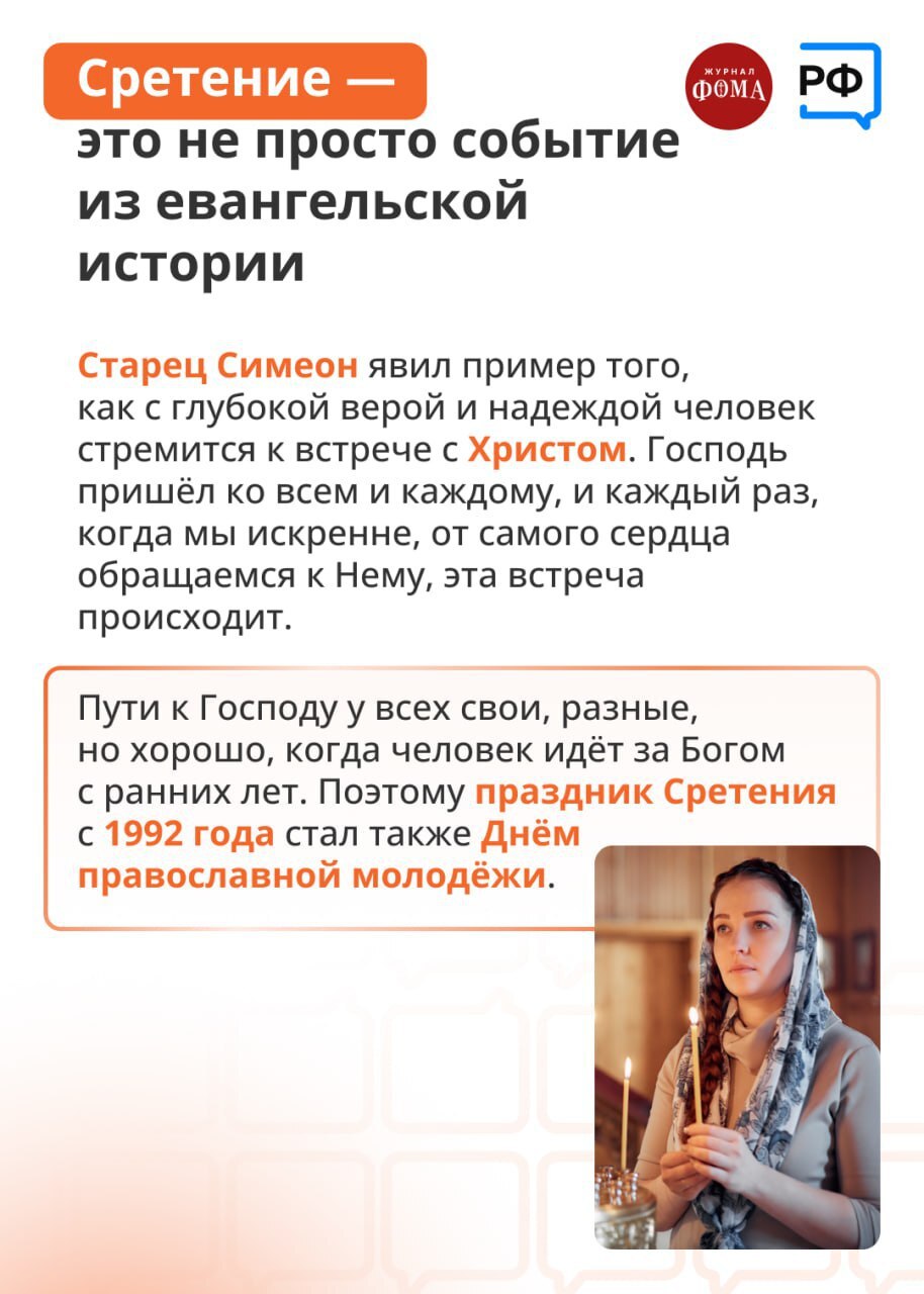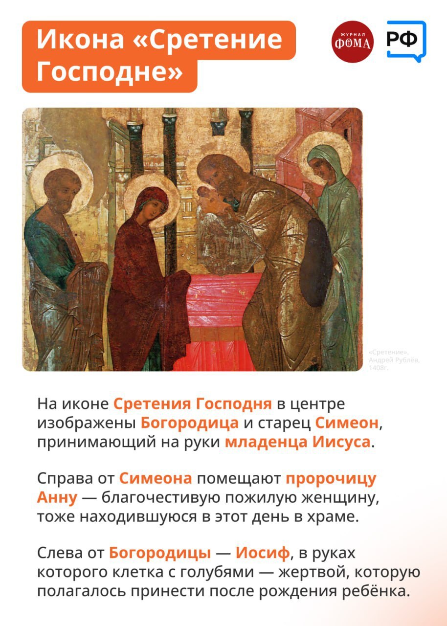 В этот день Церковь вспоминает встречу ветхозаветного праведника Симеона с младенцем Иисусом в Иерусалимском храме.