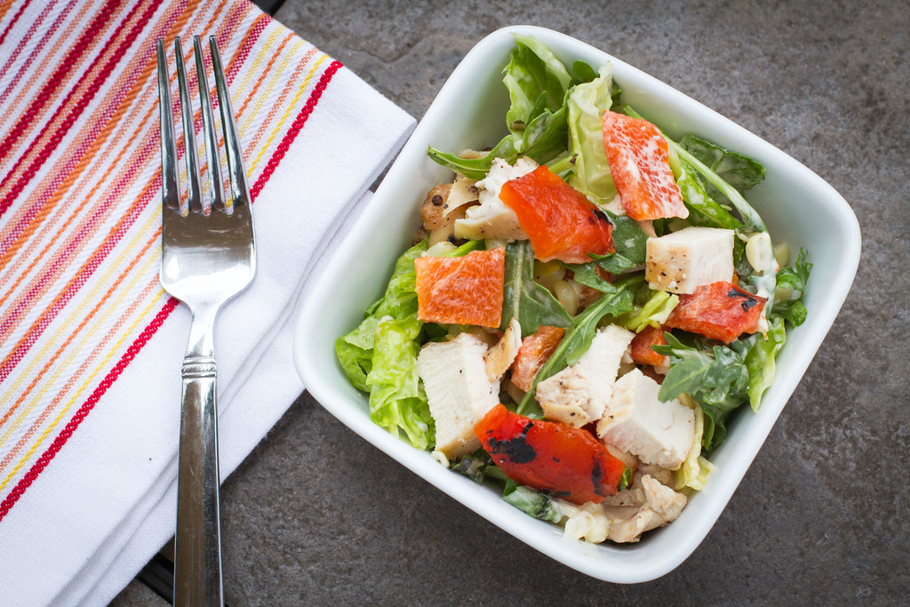 Этот салат станет отличным вариантом для обеда. Предварительно подготовьте куриную грудку — её можно обжарить или запечь. В нарезанный свежий овощной микс, включая огурцы, помидоры и сладкий перец, добавьте листовой салат. Заправьте всё оливковым маслом с лимонным соком. Такой салат легко взять с собой, он насыщает и насыщает витаминами.