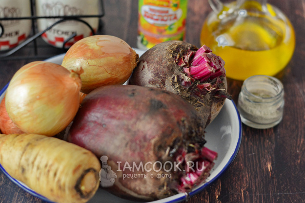 Для начала необходимо подготовить овощи: тщательно промыть, очистить и пропустить через мясорубку с крупной решёткой — свеклу, корень петрушки и лук стоит переработать по отдельности.
