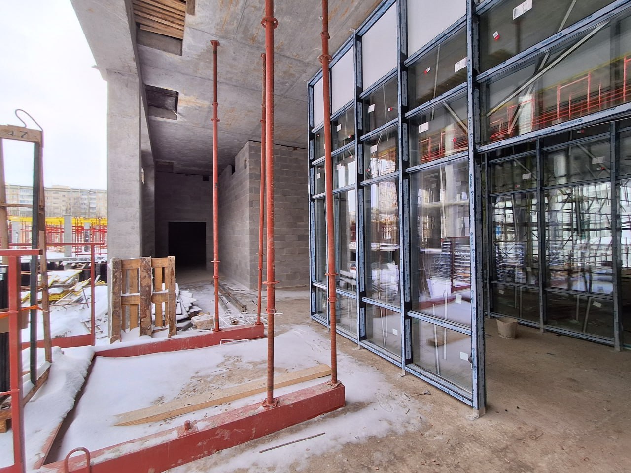 В блоке «А» строители завершили кладку стен выше нулевой отметки, монтаж металлоконструкций ферм, связей, балок покрытия второго этажа и огнезащиту металлоконструкций. В настоящее время ведётся монтаж кровли, установка окон и витражей. Также рабочие приступили к устройству вентилируемого фасада, внутренней канализации и чернового пола цокольного этажа.