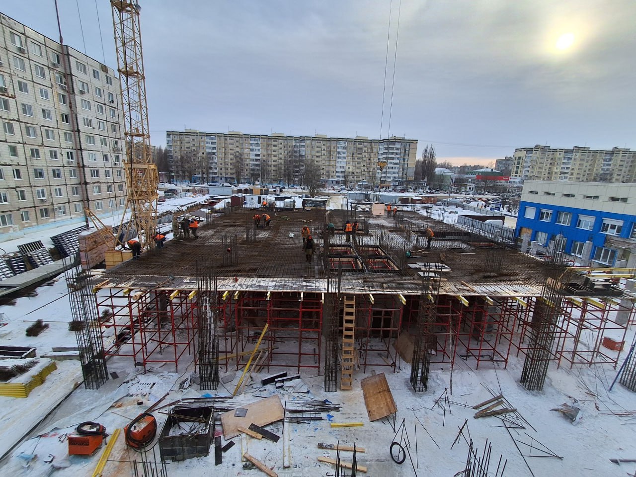 В блоке «Б» на цокольном этаже строители выполняют наружную гидроизоляцию, устройство перекрытия, перегородок и стен. На первом и втором этажах продолжается монтаж колонн, монолитных стен и перекрытия первого этажа, начато устройство монолитных стен и перекрытия третьего этажа.