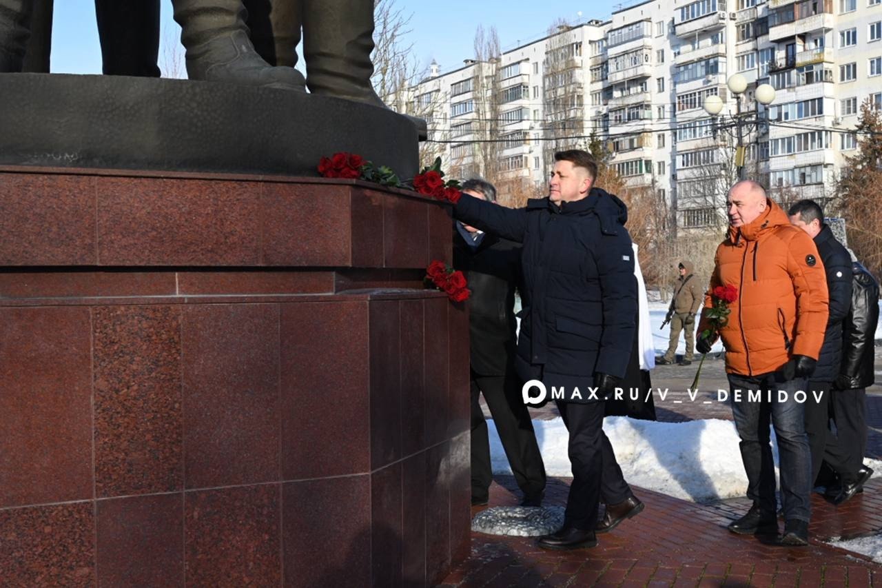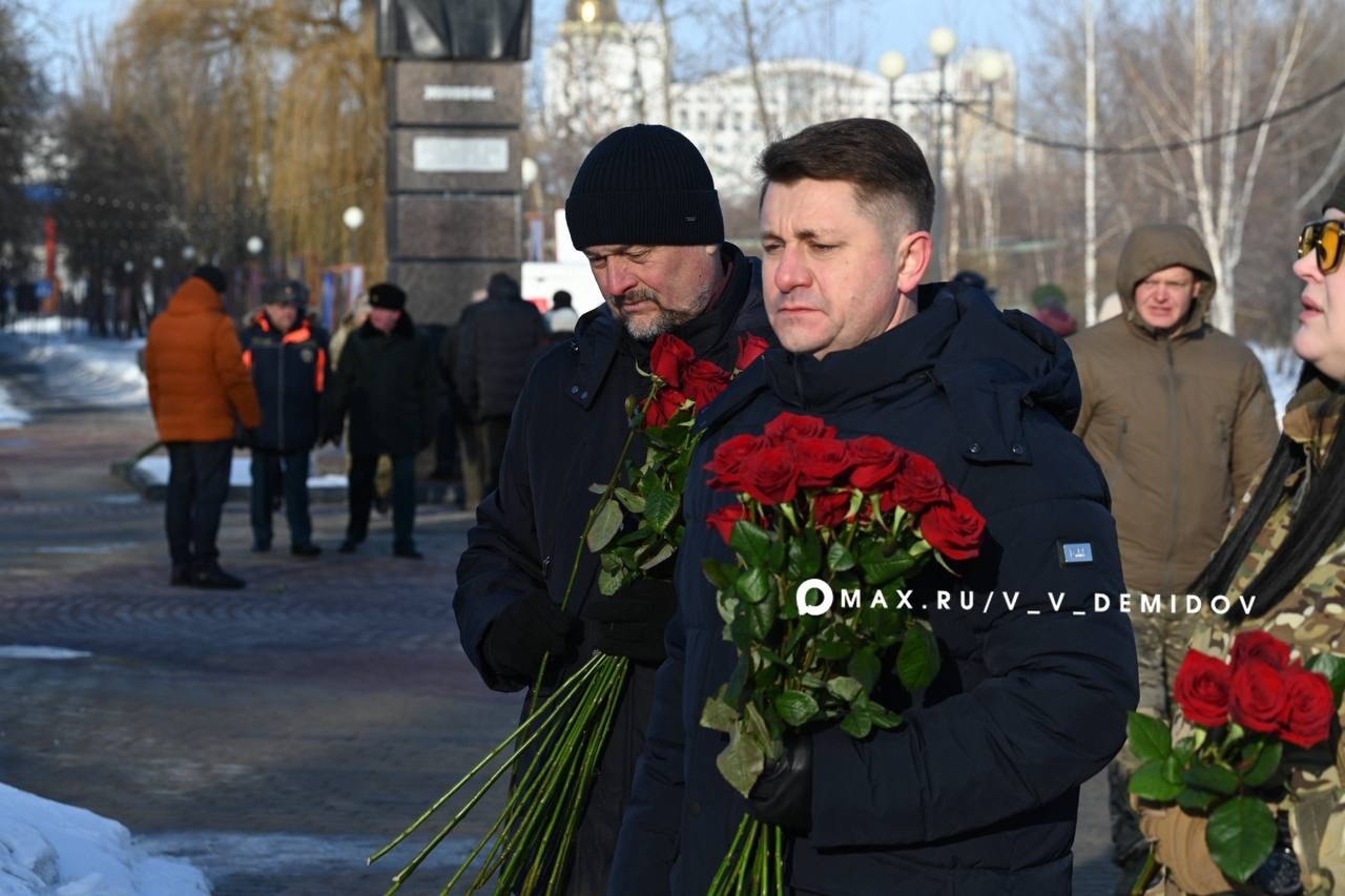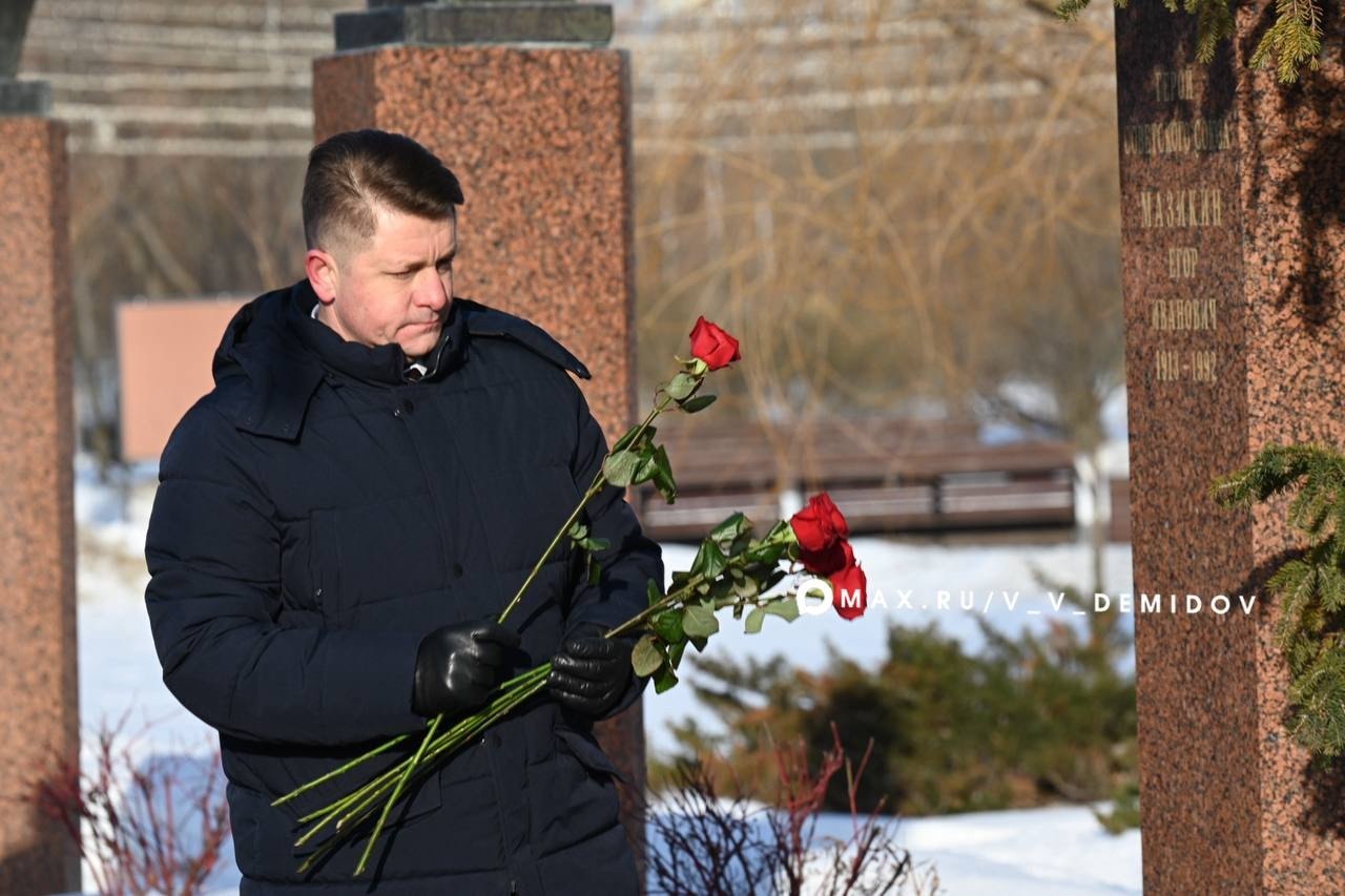 В День защитника Отечества первые лица региона и города, ветераны СВО, бойцы самообороны, депутаты и почётные гости возложили цветы к Вечному огню, памятникам Героям