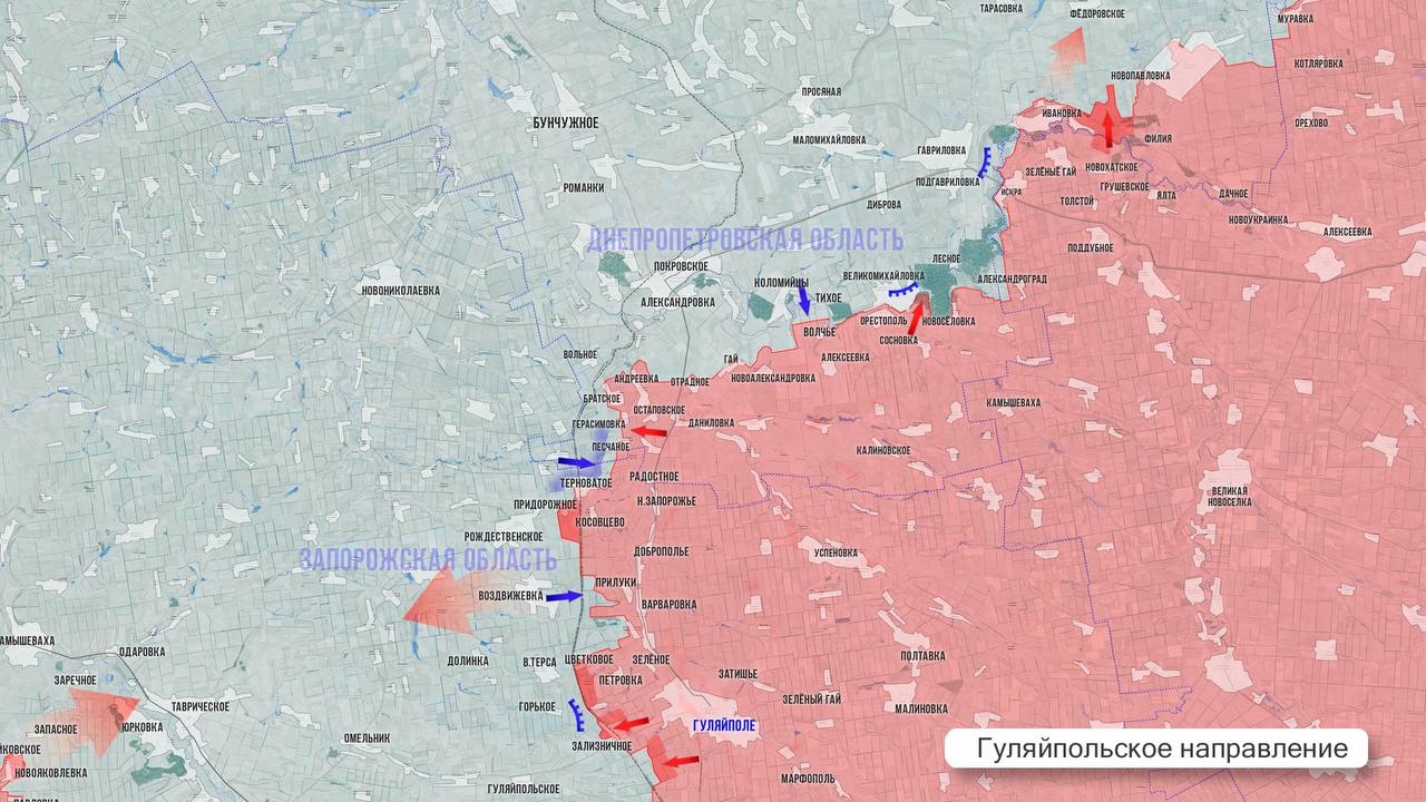 На Гуляйпольском направлении ВС РФ стараются сдвинуть линию фронта к западу от ж/д и выровнять его по линии Рождественское - Верхняя Терса - Гуляйпольское. ВСУ на этом участке предпринял несколько безуспешных контратак. В районе с. Прилуки продолжаются ожесточённые бои, оно в «серой зоне». Противник вбрасывал дезинформацию о присутствеи в с. Радостное, но она не подтвердилась. На северном фланге участка противник предпринимал атаки в районе Гая, наши бойцы их отбили. Сложная ситуация остаётся к югу от Великомихайловки и Орестополя. Противник присутствует на западных окраинах с. Терновое, а участок фронта от Тернового до Великомихайловки находится в «серой зоне».