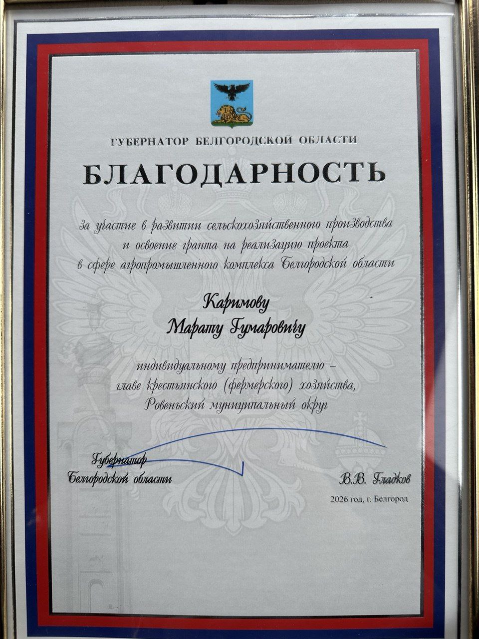 В городе Короча житель нашего округа Марат Каримов был награждён Благодарностью Губернатора Белгородской области за победу в конкурсе по отбору проектов на предоставление грантов в форме субсидий «Агромотиватор».