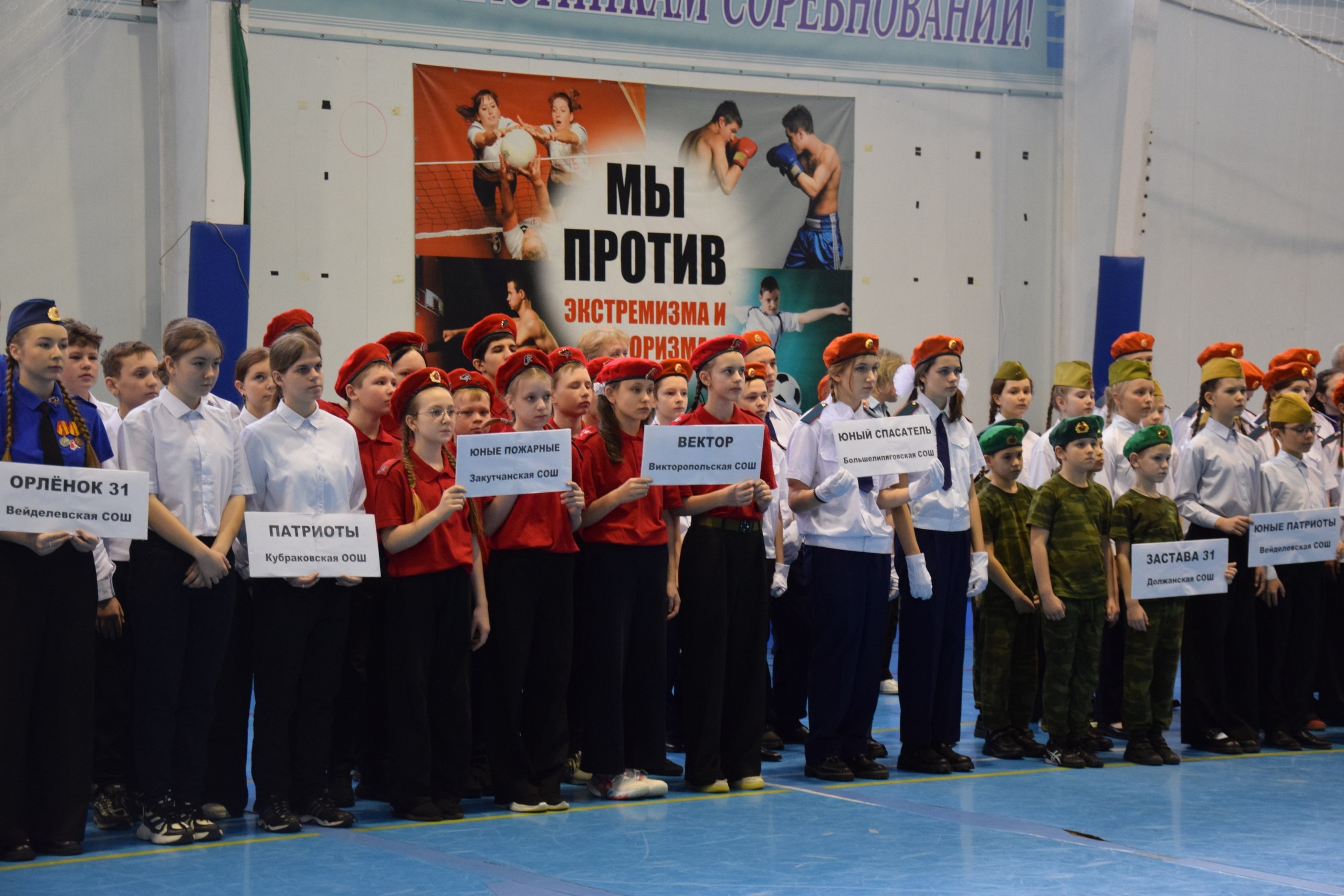 В спортивном зале Вейделевского ФОКа собрались 19 команд – это кадетские и юнармейские отряды, а также военно-патриотические клубы нашего округа.