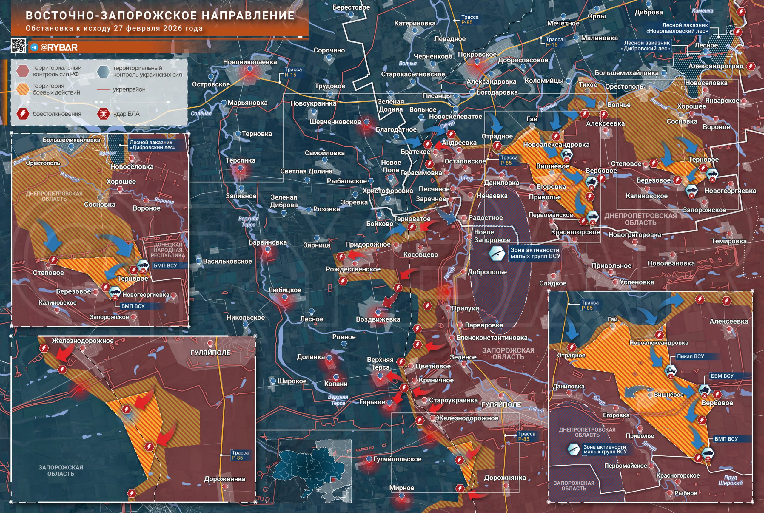 НаВосточно-Запорожском направлении поступают свидетельства недавних украинских атак. Удары по бронетехнике ВСУ зафиксированы в окрестностях Тернового, Березового и Вербового.