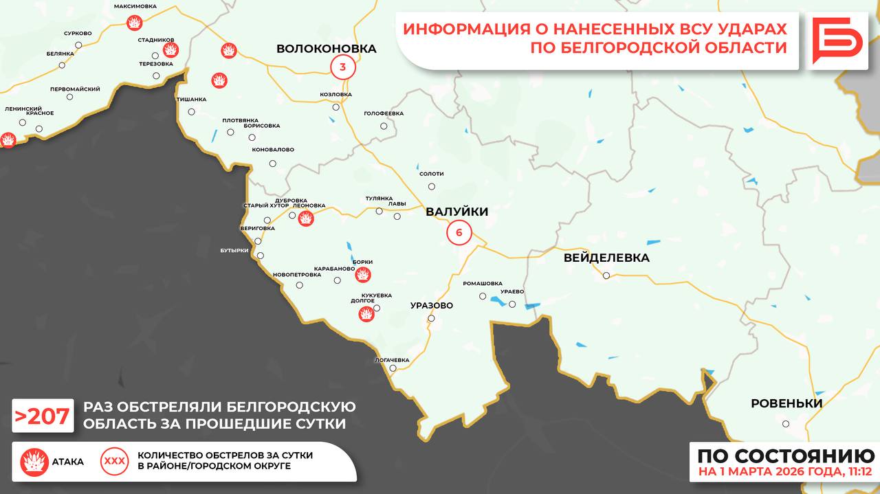 За прошедшие сутки ВСУ обстреляли Белгородскую область не менее 207 раз