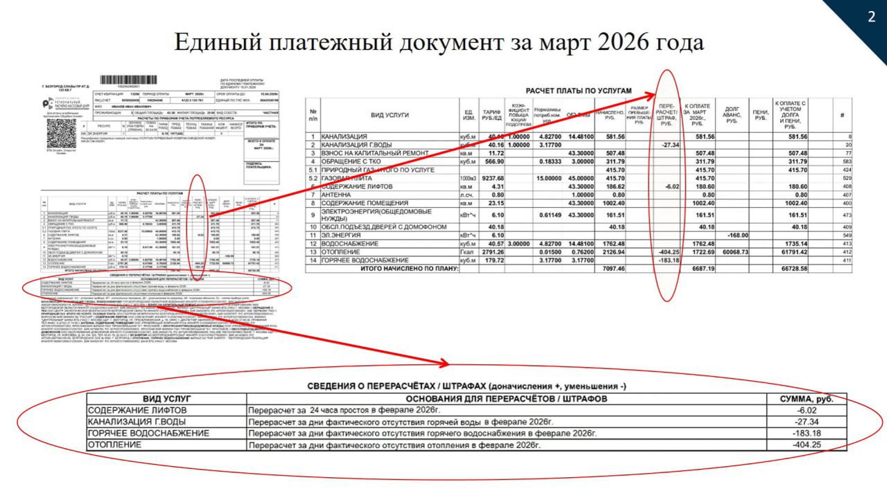 В Белгороде сделали перерасчёт за услуги, которые оказывались с перебоями из-за обстрелов. В платёжках, которые придут с 10 марта, жители увидят суммы уже с пересчётом, в них укажут периоды, за которые он сделан.