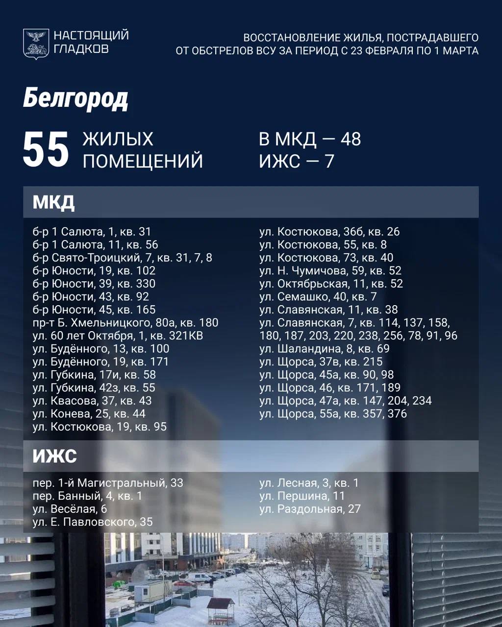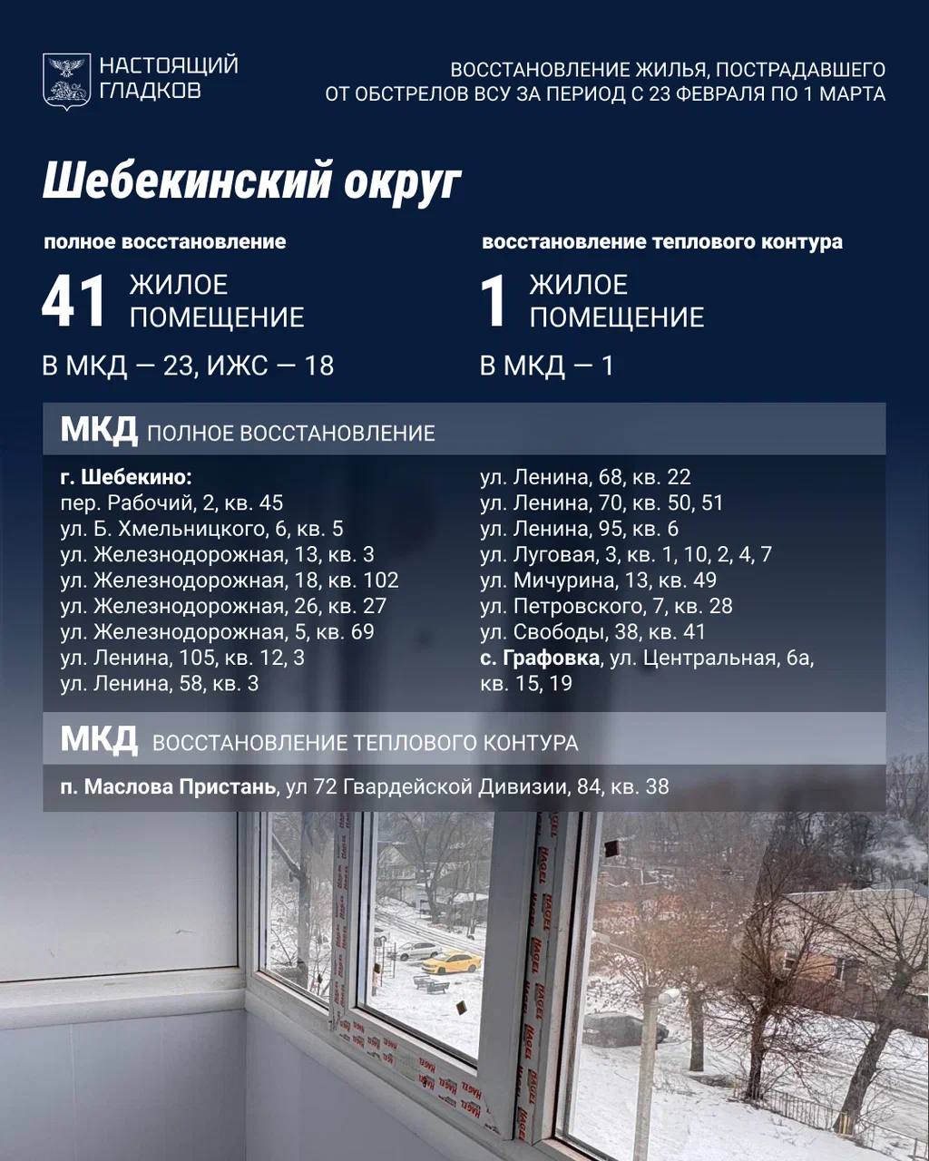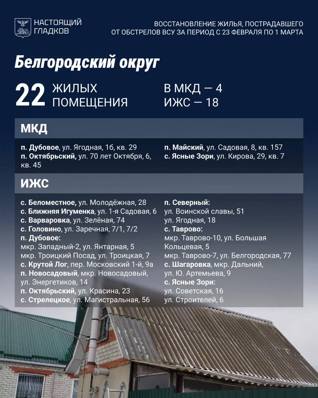 По Белгородскому округу за неделю полностью восстановлено 22 объекта. Прирост на 20 повреждённых жилых помещений и 74 автомобиля. Перечислены компенсации по 144 машинам.