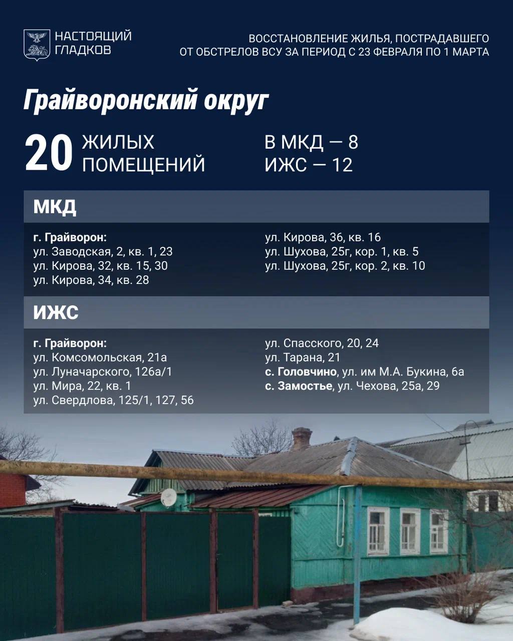 В Грайворонском округе восстановлено 20 домов и квартир. За неделю повреждения зафиксированы по 77 жилым помещениям и 75 машинам.