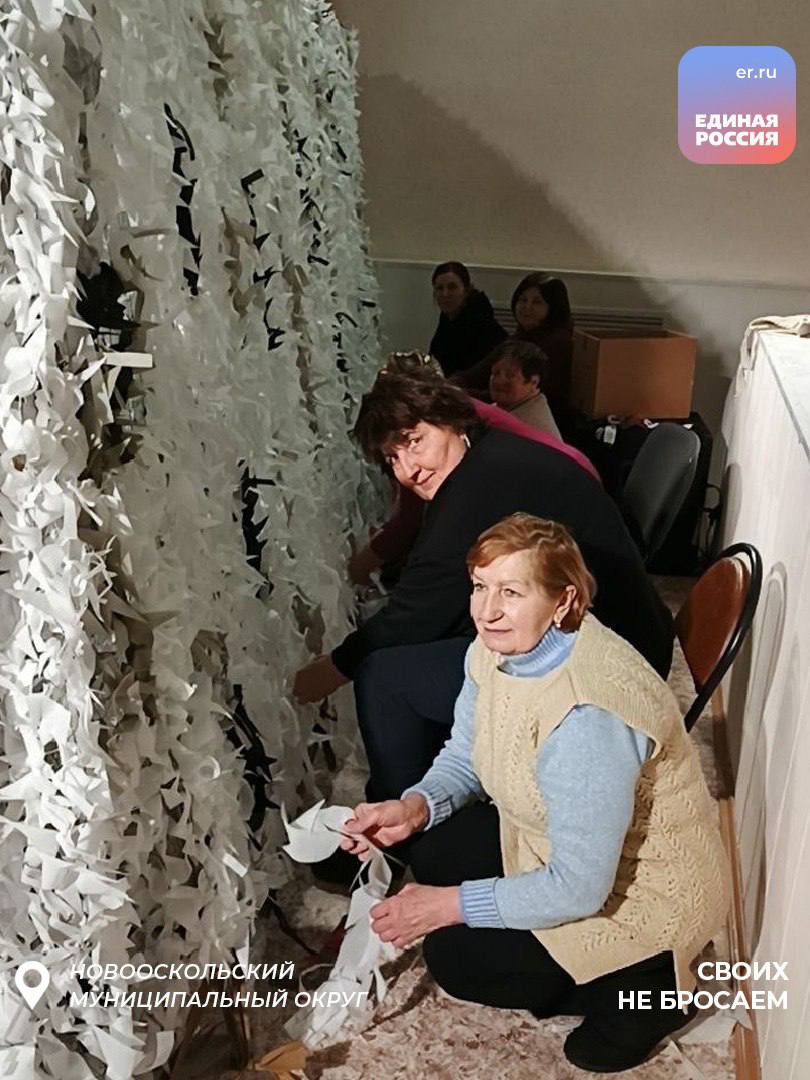 В селе Беломестное члены и сторонники Партии, а также местные жители плетут маскировочные сети для военнослужащих. Каждый день из обычных лоскутков ткани они создают защиту для тех, кто рискует своей жизнью ради нашего будущего.