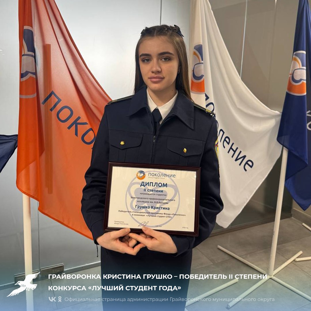 Фонд «Поколение» подвёл итоги конкурса «Лучший студент года», выбрав 30 победителей. Среди них – наша землячка, Кристина Грушко. Эта талантливая студентка Белгородского правоохранительного колледжа имени Героя России В.В. Бурцева, выпускница Гора-Подольской школы, с юных лет активно проявляет себя как в творчестве, так и в спорте.