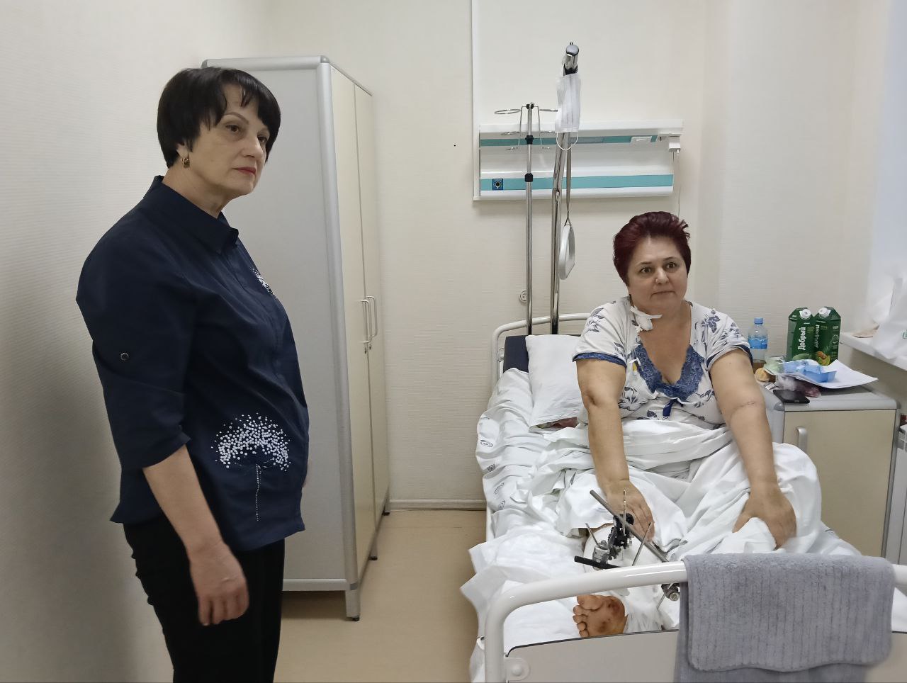 Несмотря на серьёзную травму правой ноги женщина приветливо и с улыбкой встречает, благодарит коллегу, который оказался рядом в момент удара, своевременно оказал ей первую помощь и помог сохранить жизнь.
