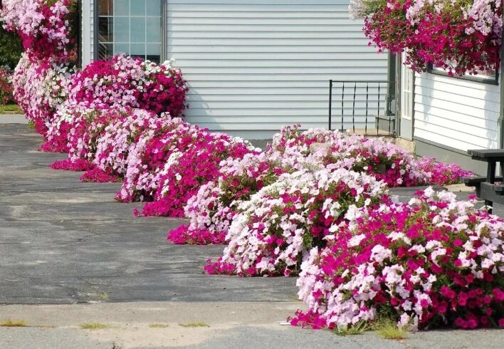 - Петуния. Эта не требовательная культура пользуется популярностью благодаря множеству оттенков и длительному периоду цветения — с начала лета до октября. Петуниям нравятся солнечные места и влажный грунт.