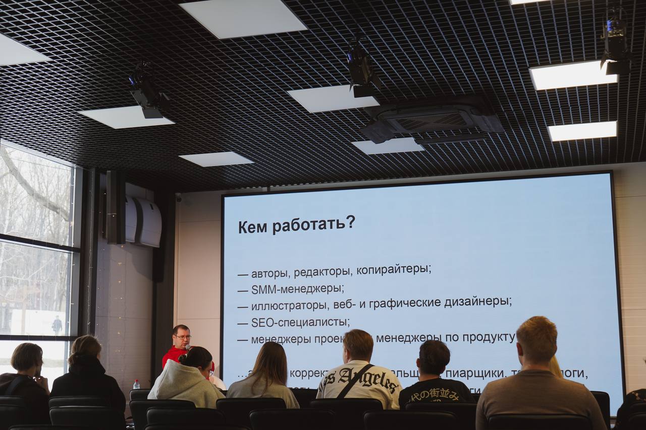 Спикером выступил шеф-редактор Тинькофф-журнала Сергей Антонов. Он рассказал студентам, как сегодня искать работу в диджитал-среде, на какие кнопки жать при составлении резюме и где новички чаще всего проваливаются при отклике на вакансии.
