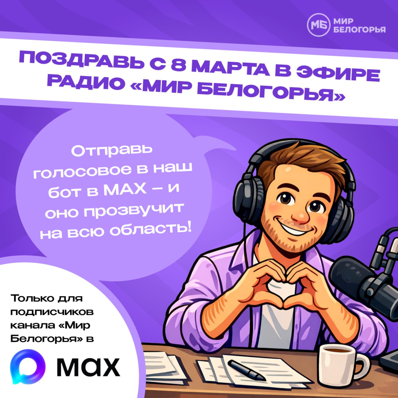 Хотите, чтобы тёплые слова для любимых и близких прозвучали на всю область? Отправляйте их в наш бот в MAX – они выйдут в эфире радио «Мир Белогорья».