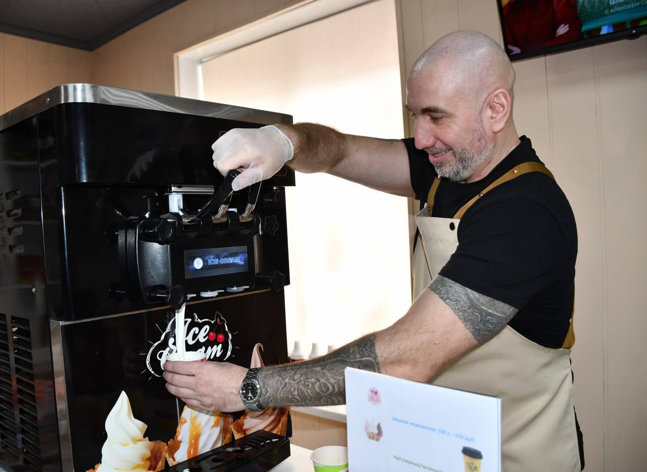 В ассортименте «Сладкого царства» — всё для душевного чаепития: конфеты, печенье, пирожные и другие десерты. А для маленьких гостей приготовлен особый сюрприз: по выходным здесь можно полакомиться мягким мороженым. Александр Викторович поделился планами: с 1 мая ассортимент расширится — каждый день будут радовать молочными коктейлями, а также мягким и жареным мороженым из фризера.