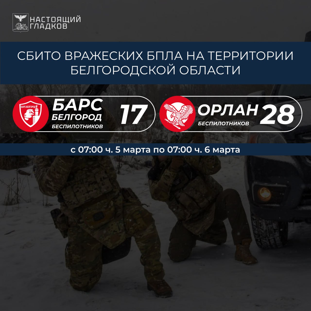 Информация о сбитиях всех типов вражеских БПЛА на территории Белгородской области подразделениями «БАРС-Белгород» и «Орлан»