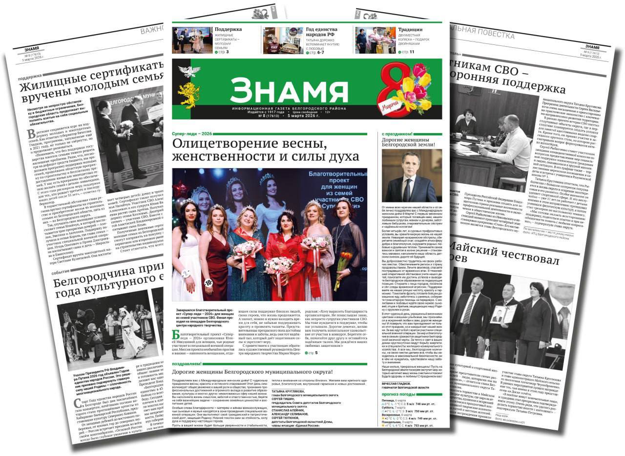 Белгородский муниципальный округ информирует читателей, что в номере газеты «Знамя» от 5 марта 2026 года публикуются важные новости округа, а также официальные объявления и проекты