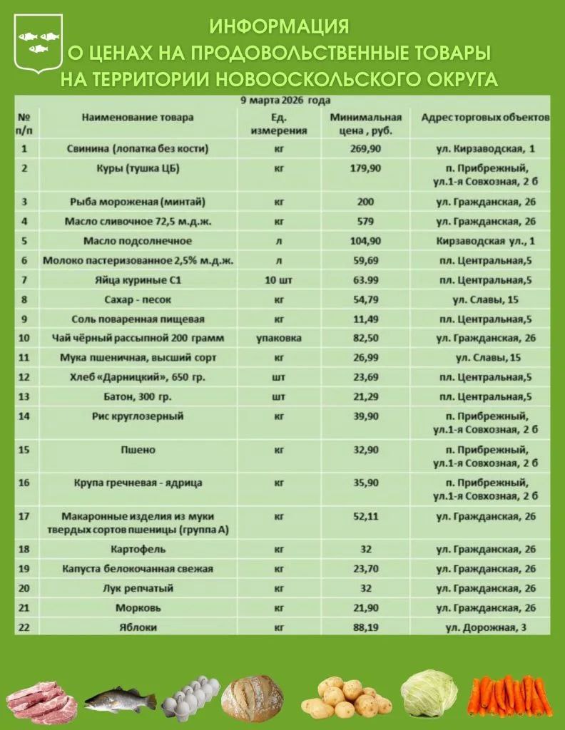 Делюсь с вами актуальной подборкой минимальных цен на продовольственные товары на территории Новооскольского муниципального округа.