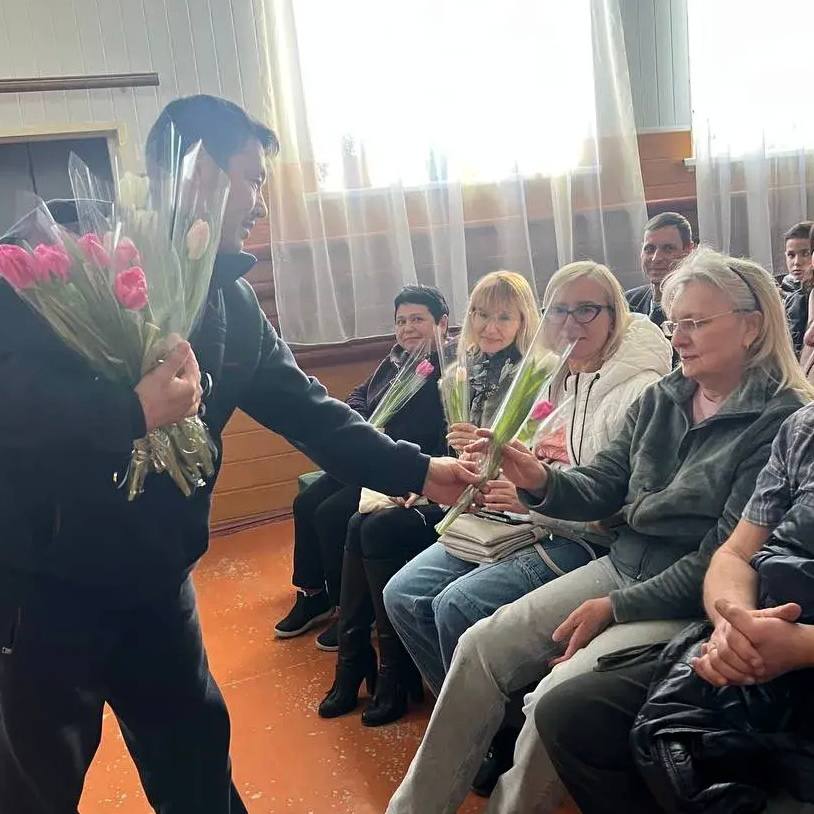 Но на этом сюрпризы не закончились. Виктор поздравил каждую женщину в зале, подарив им весенние тюльпаны. Это доказательство того, что для искренней любви и благородства не существует преград.