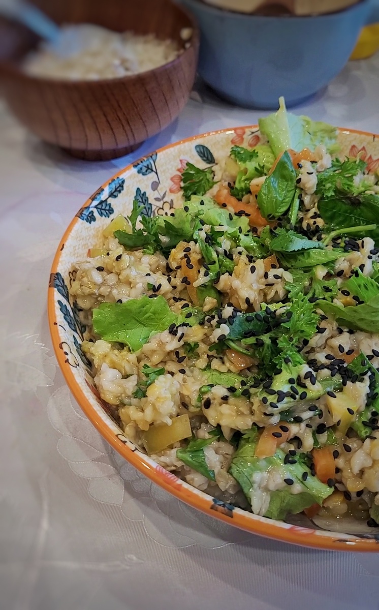 Приготовление: Промойте зелень. Отварите овсянку в течение 20-25 минут, или залейте её тёплой водой и оставьте на 4-6 часов. Нарежьте или порвите листья салата. Нарежьте мелко болгарский перец. Смешайте все ингредиенты с готовой овсянкой, добавив специи и заправив маслом с лимонным соком. Сверху посыпьте базиликом и кунжутом.