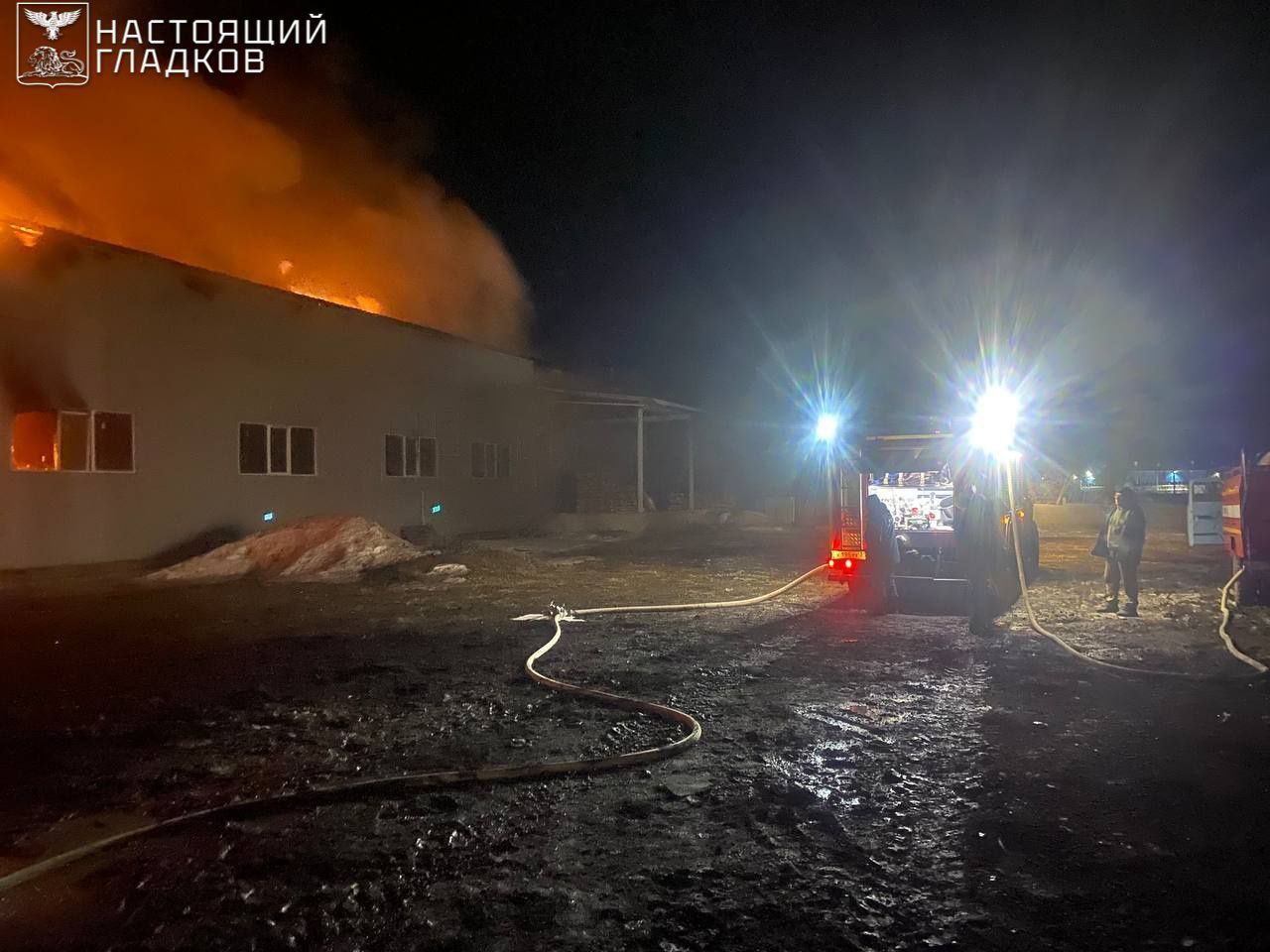 В Новом Осколе в результате ударов трёх беспилотников самолётного типа загорелась кровля складского помещения — сотрудники МЧС занимаются тушением пожара (фото 1 и 2).