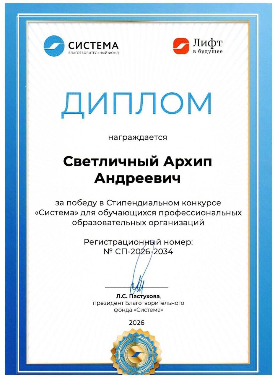 Наш земляк, студент медицинского колледжа НИУ «БелГУ» Архип Светличный, добился выдающегося успеха. Он вошёл в число 50 лучших студентов профессиональных образовательных организаций России и стал победителем престижного стипендиального конкурса «Система», организованного платформой «Лифт в будущее».