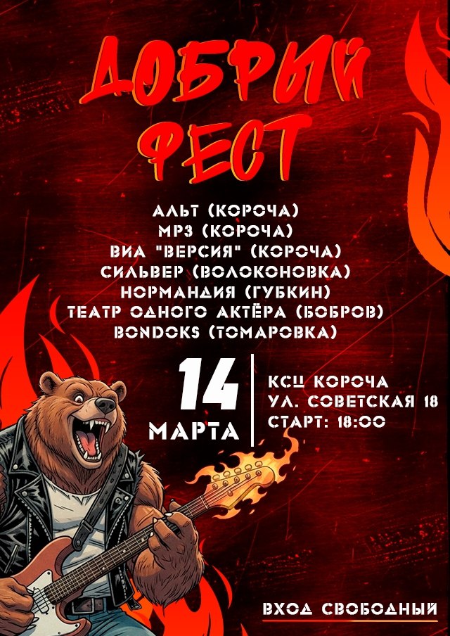 14 марта, в Культурно-спортивном центре города Короча, состоится невероятный рок-фестиваль «Добрый Фест». Лучшие музыканты из Корочи, Белгородской и Воронежской областей покажут настоящий драйв живого звука!