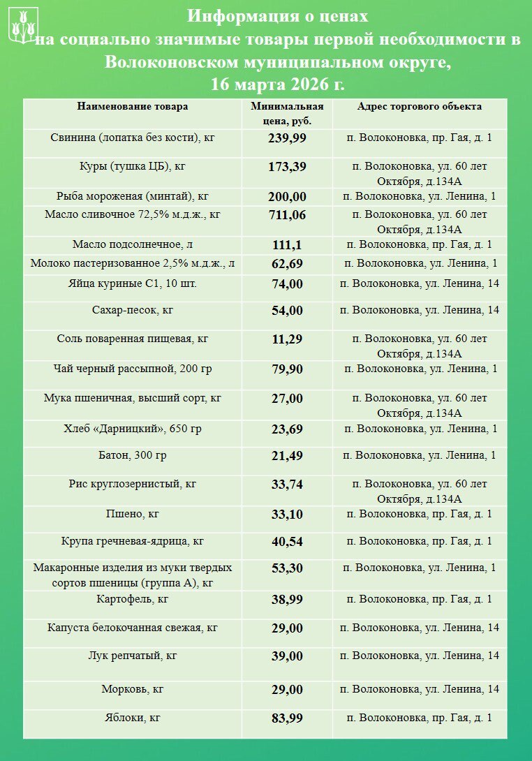 Уважаемые волоконовцы!. Информируем вас о ценах на продовольственные товары из базовой потребительской корзины, складывающихся в нашем муниципалитете на сегодняшний день