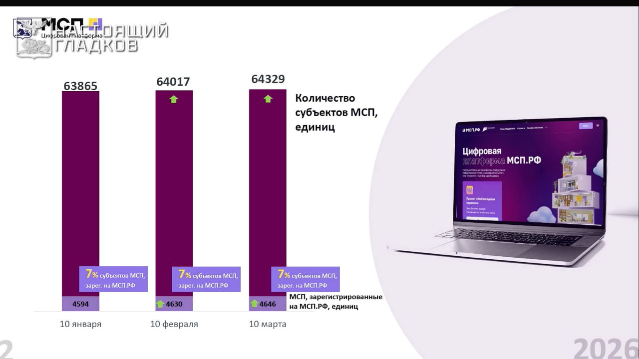За два месяца 2026 года количество субъектов МСП в регионе увеличилось до 64 329, а число пользователей цифровой платформы МСП РФ выросло до 4 646 предпринимателей.При этом доля зарегистрированных на платформе составляет 7% от общего числа субъектов МСП региона.