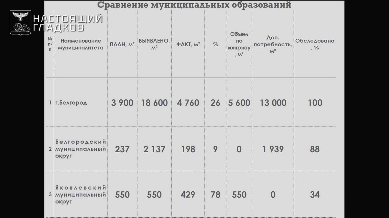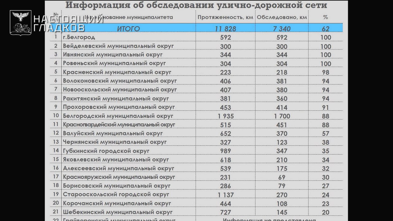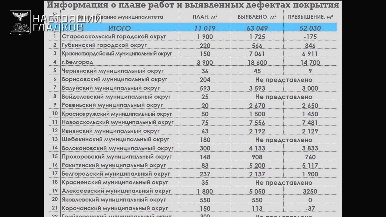 По докладу министра транспорта Сергея Викторовича Евтушенко, работы выполнены на площади 14 171 м, это 129% от первоначального плана. Наибольший объем в Старооскольском округе — 4 933 м, что составляет 260% от плана. В Белгороде отремонтировано 4 760 м (122% от плана), в Губкинском городском округе — 323 м (147%). Также 100% выполнение первоначального плана: Валуйский, Вейделевский, Ровеньский, Краснояружский и Новооскольский муниципальные округа. Но план постоянно дополняется.
