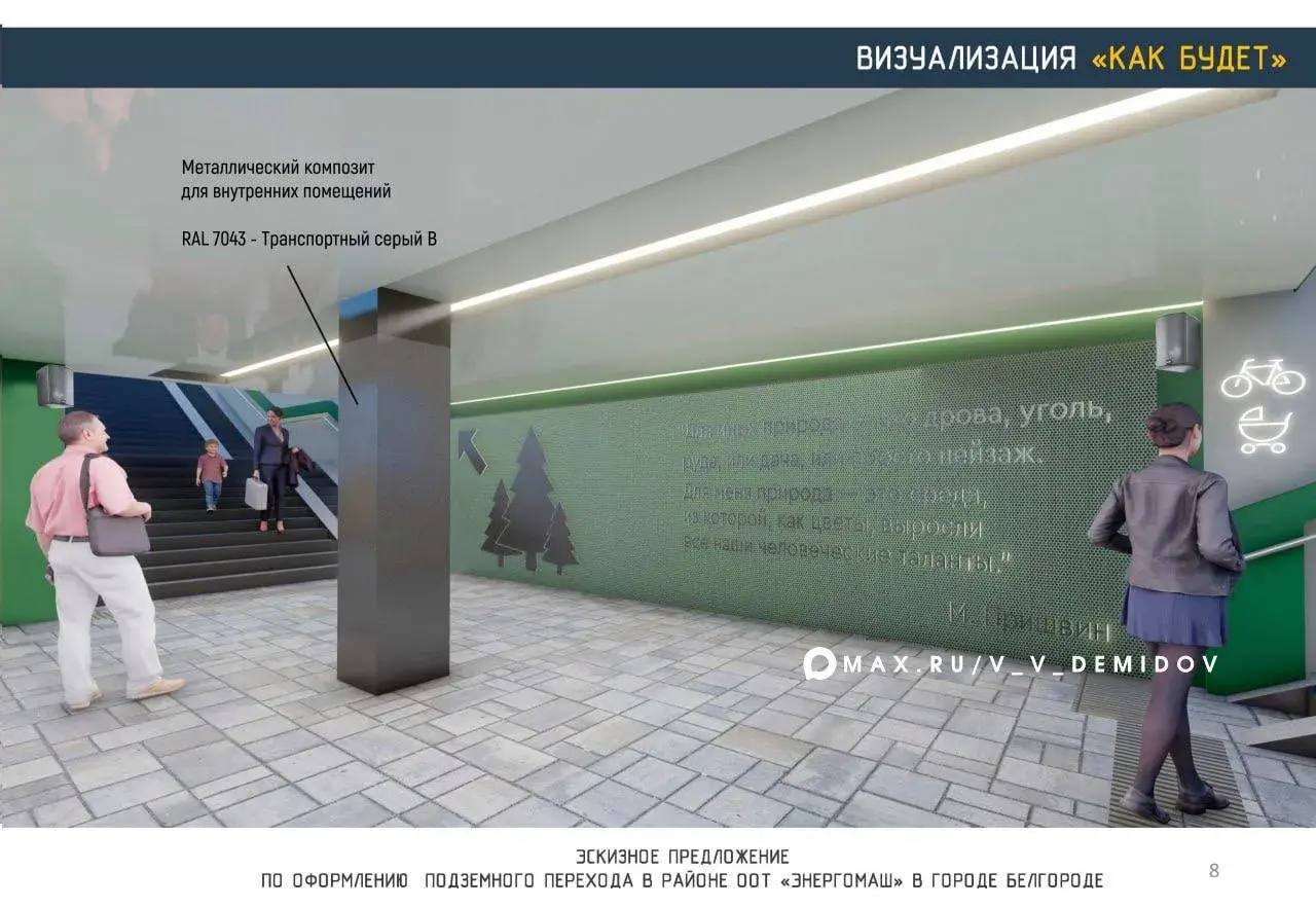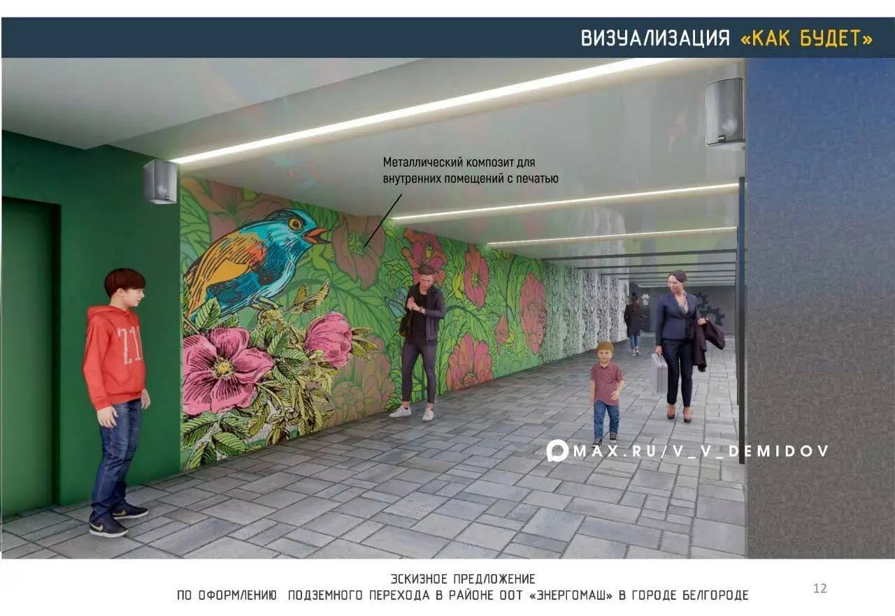 Для внутренней отделки будет использоваться металлический композит. Опыт его применения в городе уже показал свою эффективность – им отделан подземный переход через пр. Б. Хмельницкого от НИУ БелГУ в парк Победы.